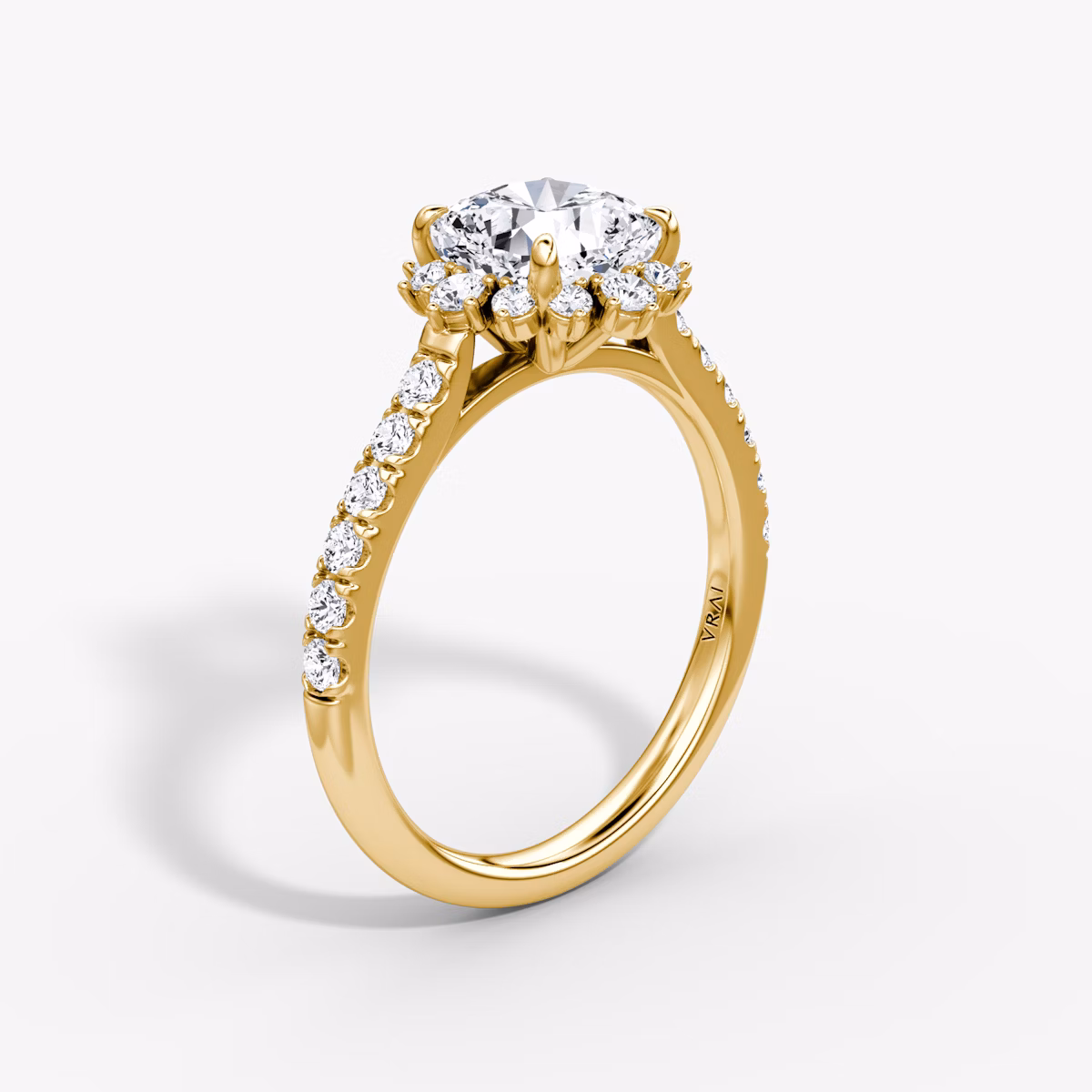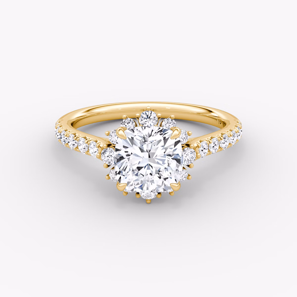 The Aurora Halo ring in 18k yellow gold with a cushion diamond