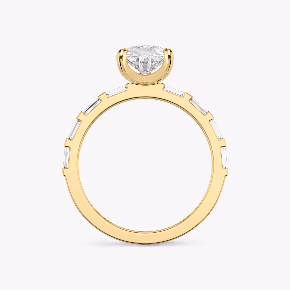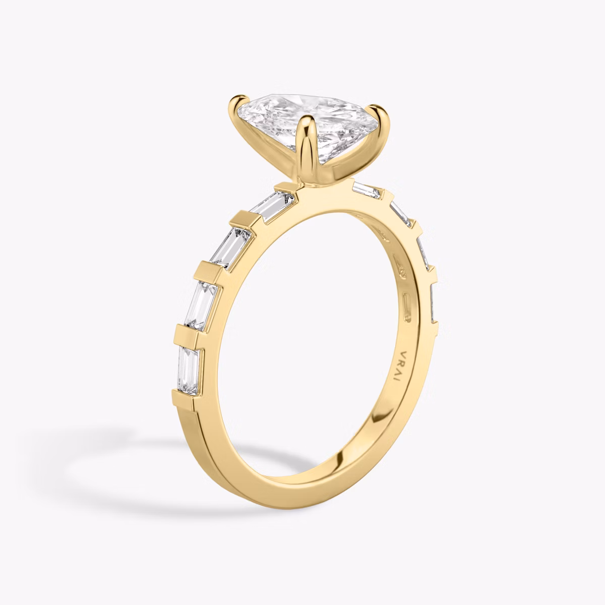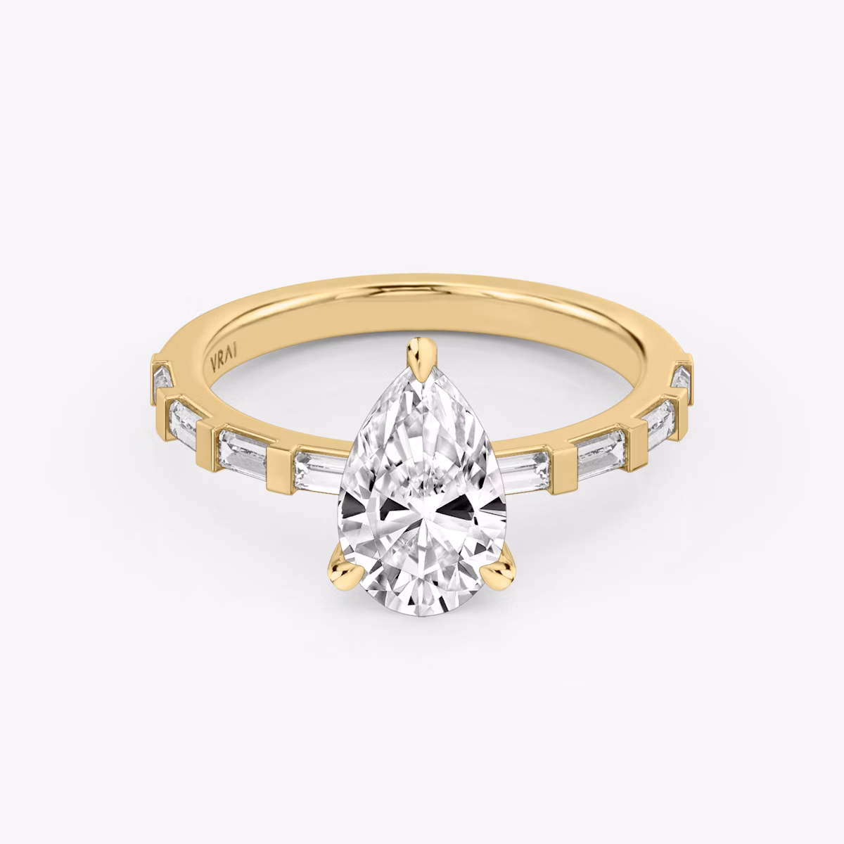 The Baguette Bar solitaire in 18k yellow gold with a pear diamond