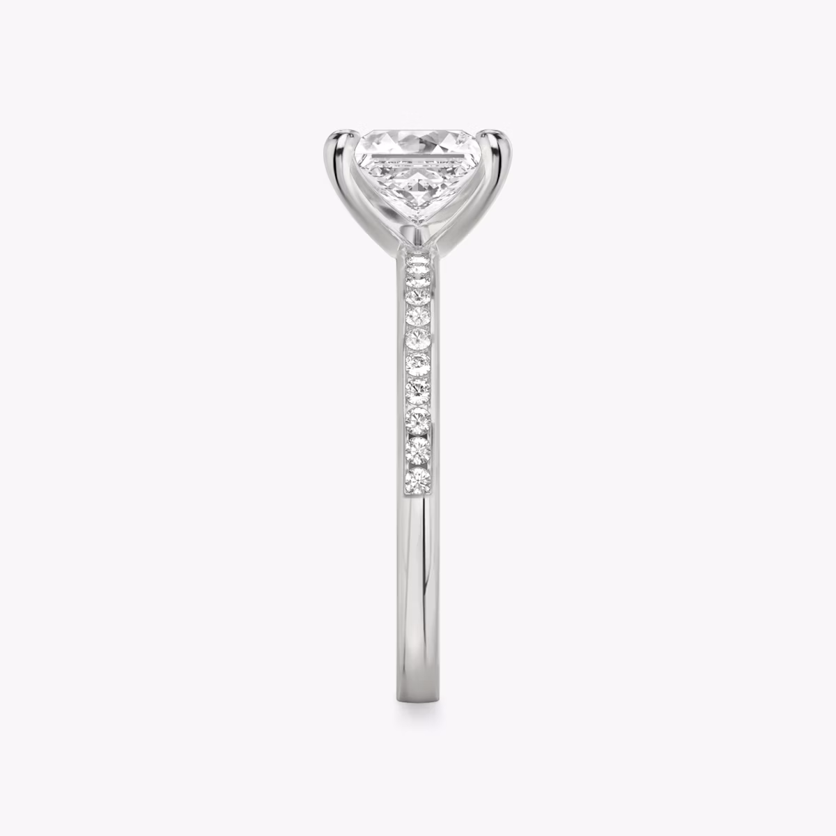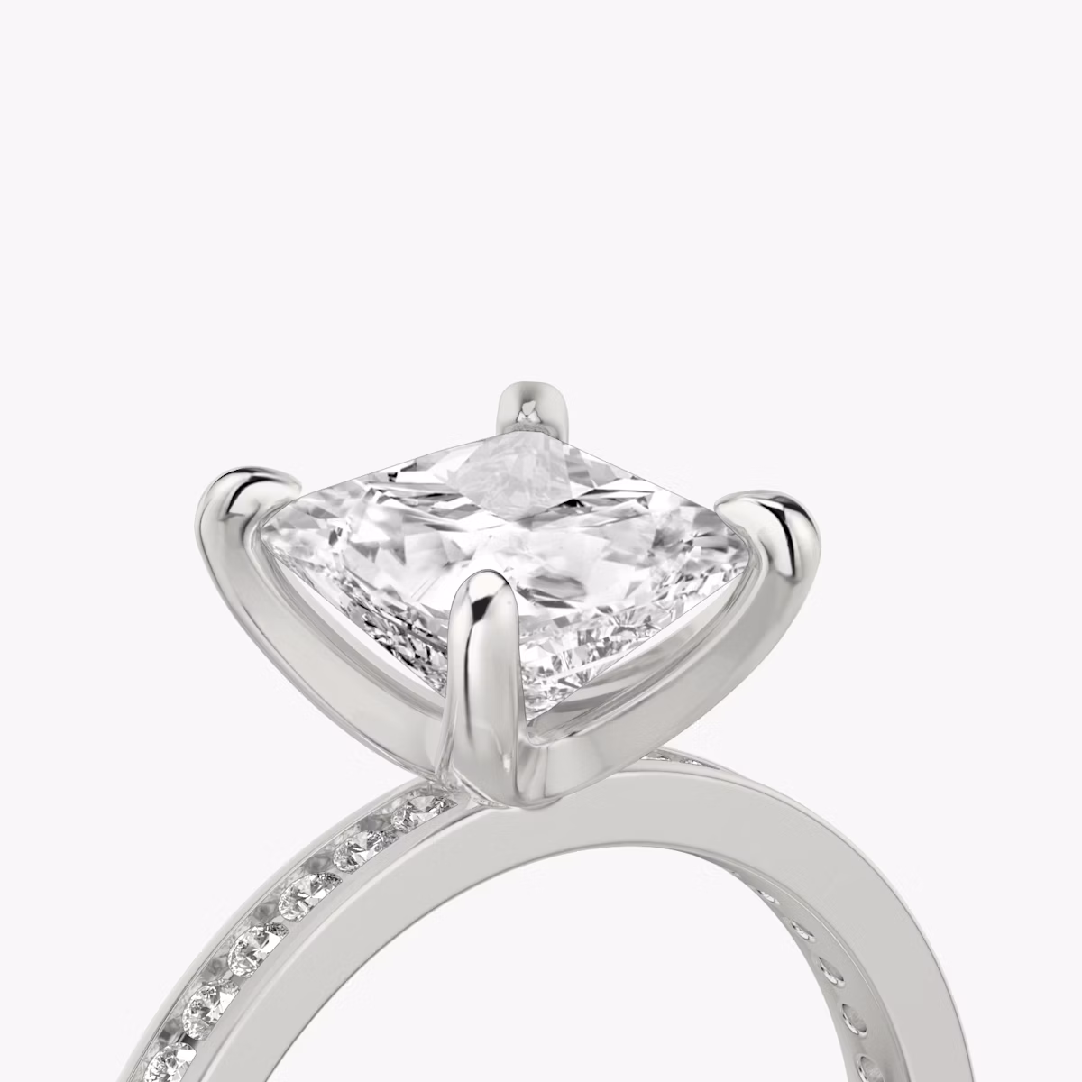 Commemorate your love with an engagement ring that is a daily reminder of your devotion. Our 4-prong setting secures your VRAI created diamond above a series of Round Brilliant or Baguette shaped diamonds inside their platinum or solid gold channel set band, creating a look of enduring sophistication.