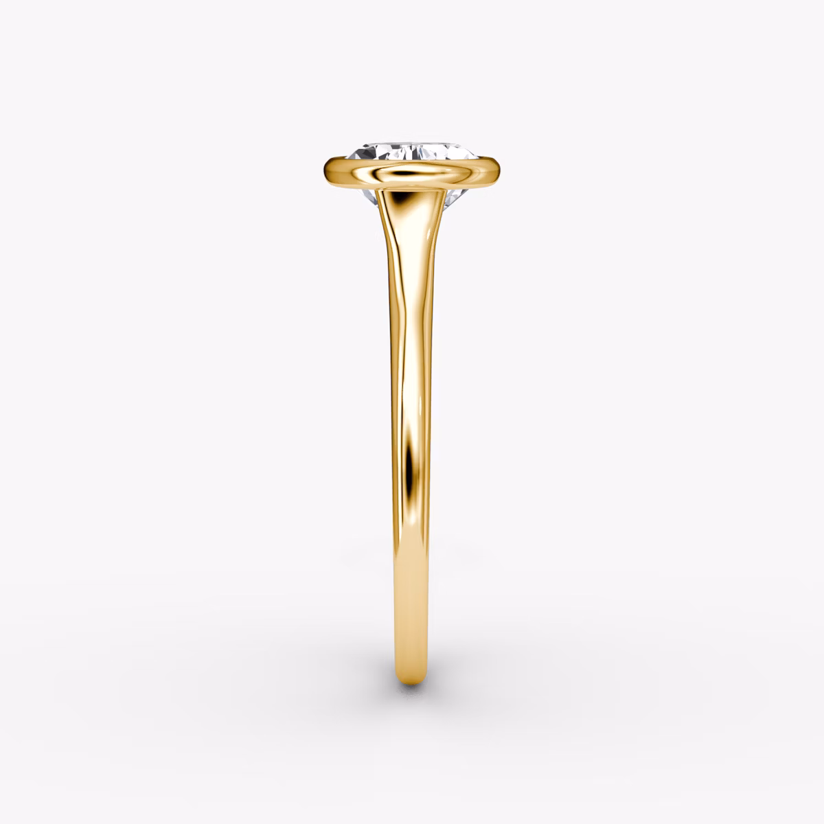 A bold, modern take on a timeless bezel setting. A flat, tapered band enhances its structured look, while the bezel and cathedral bridge invite light to flow through, maximizing brilliance and scintillation.