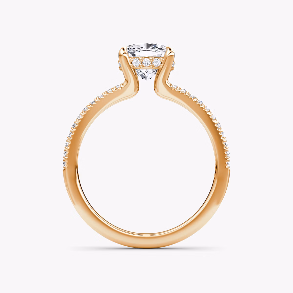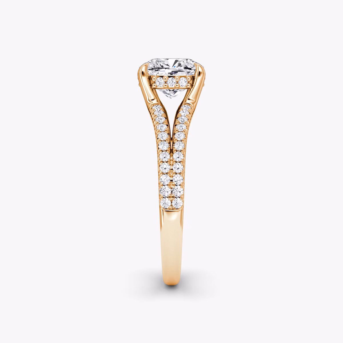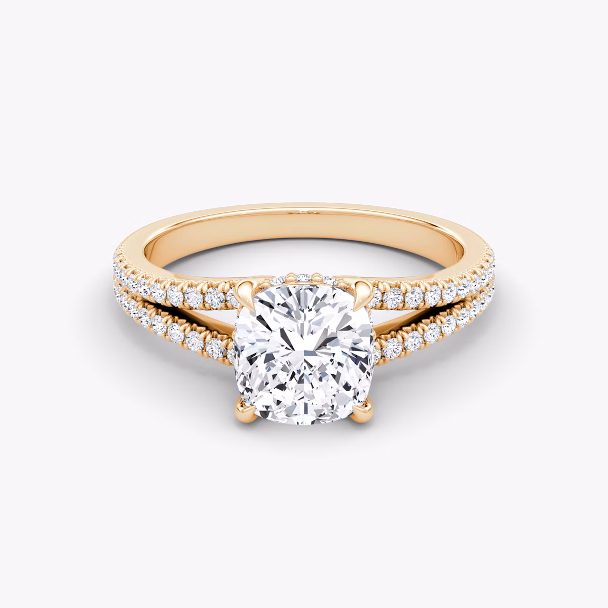 The Floating Split Band solitaire in 14k rose gold with a cushion diamond