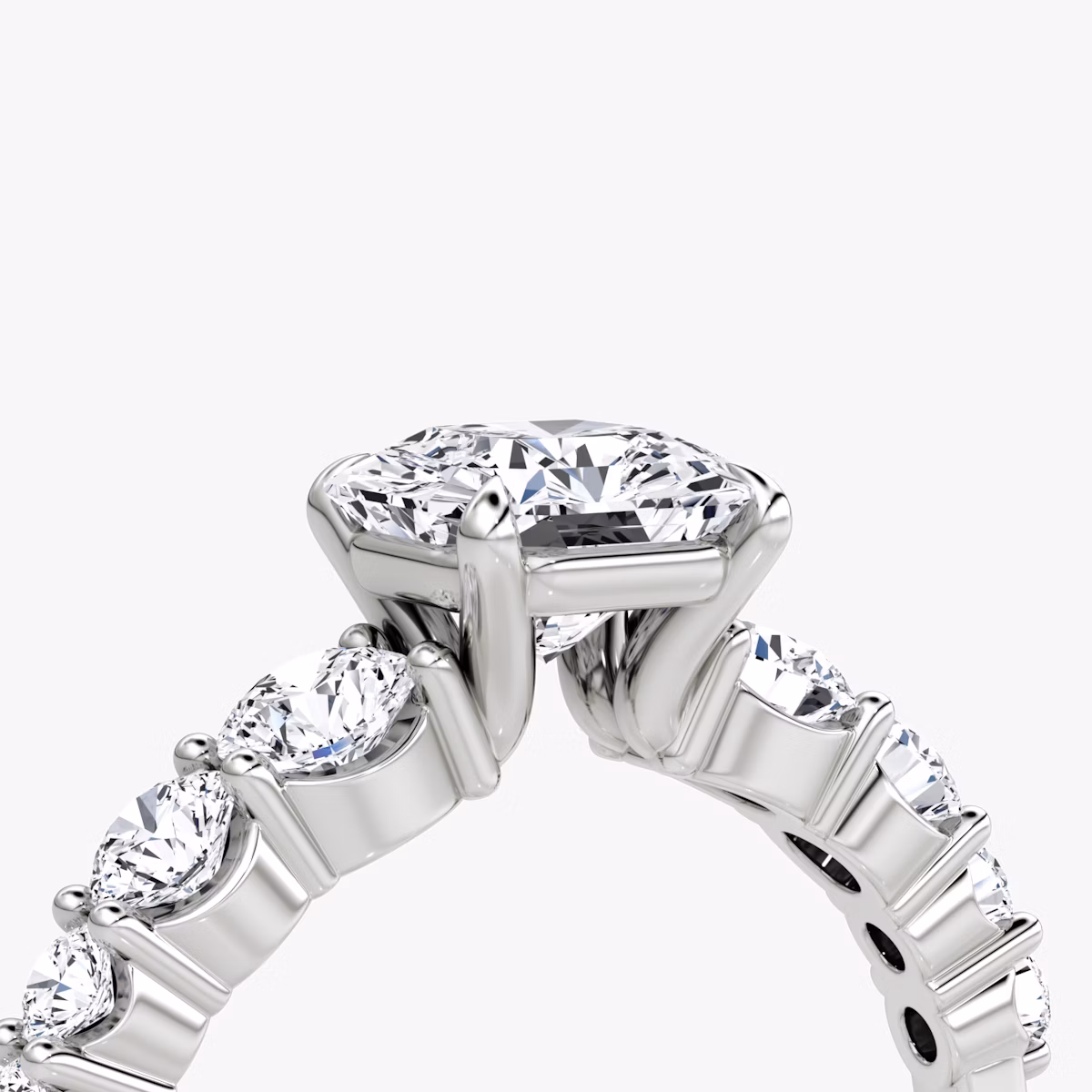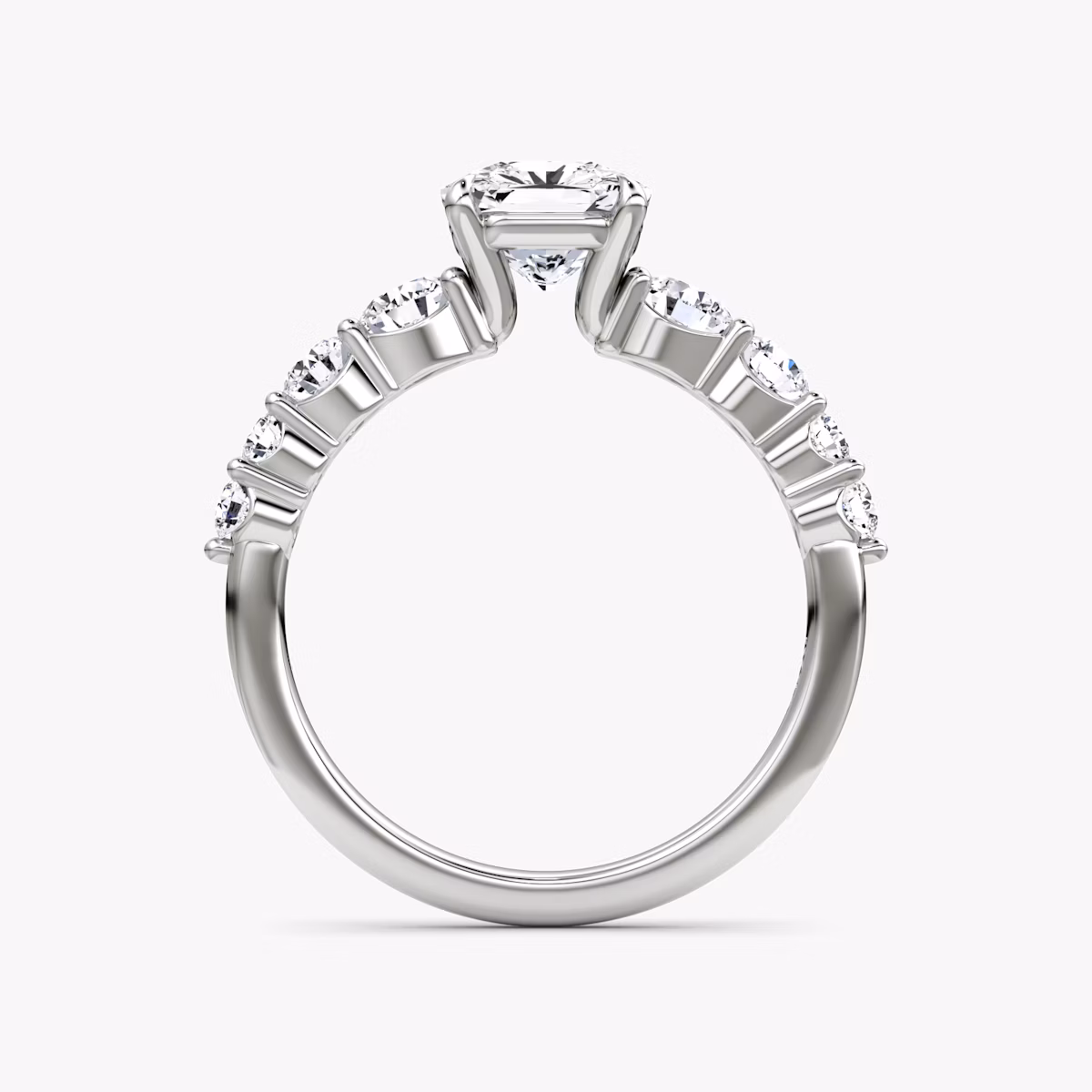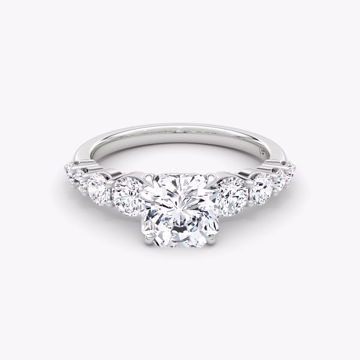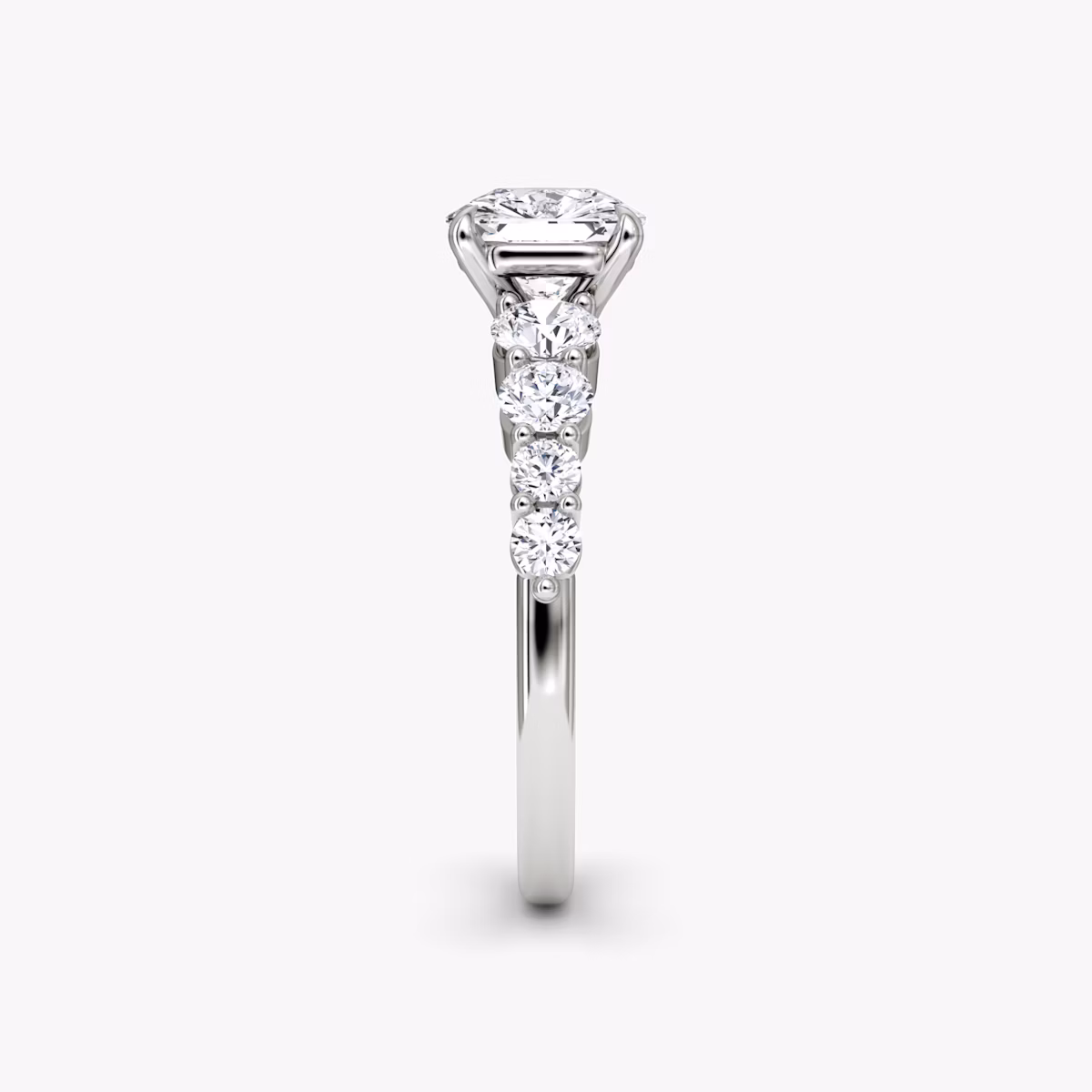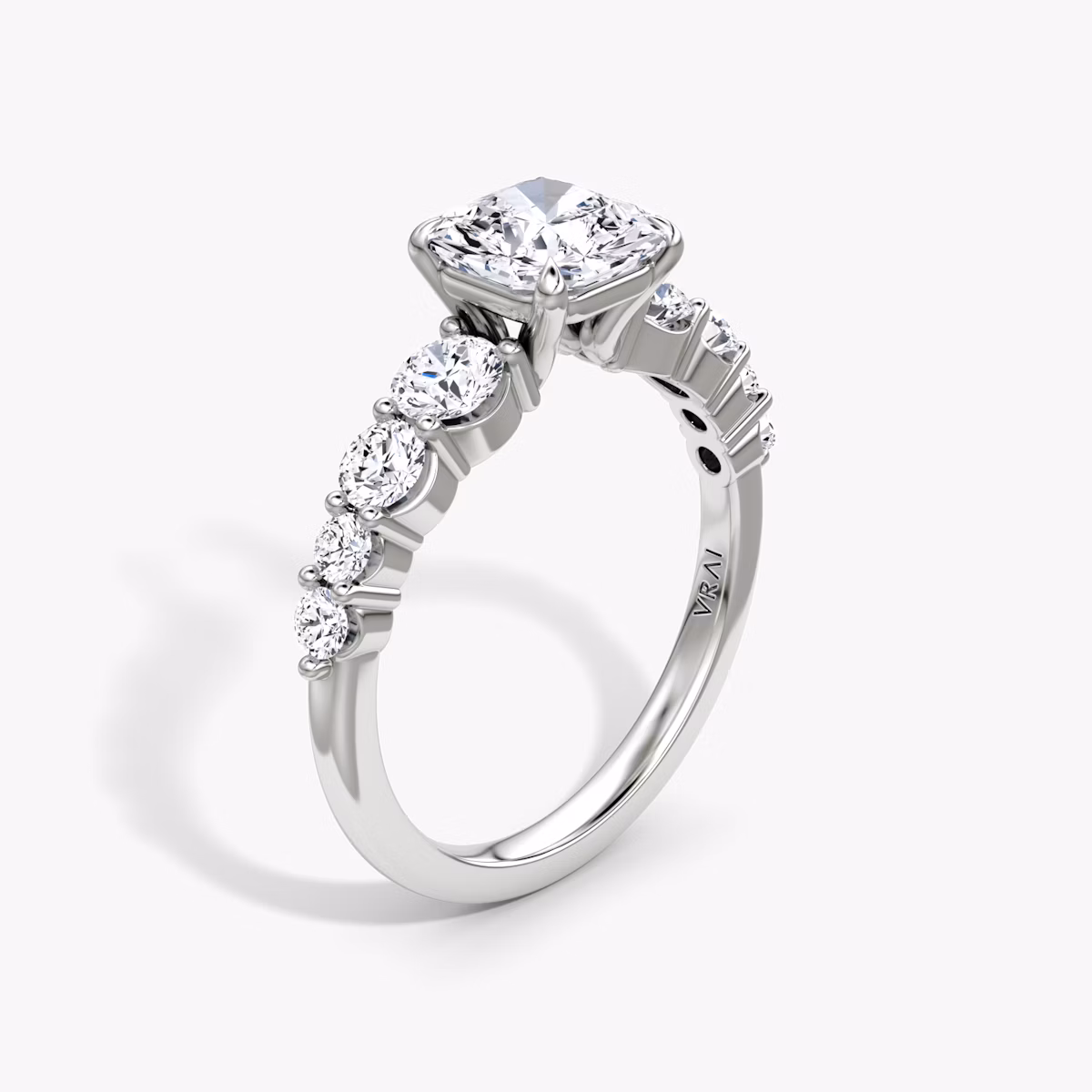 Four curved prongs caress the center stone while an array of eight VRAI created diamonds in graduated sizes appear to float alongside in the platinum or solid gold shared-prong setting. This diamond-forward take on a timeless setting is designed for maximal brilliance and ethereal elegance.
