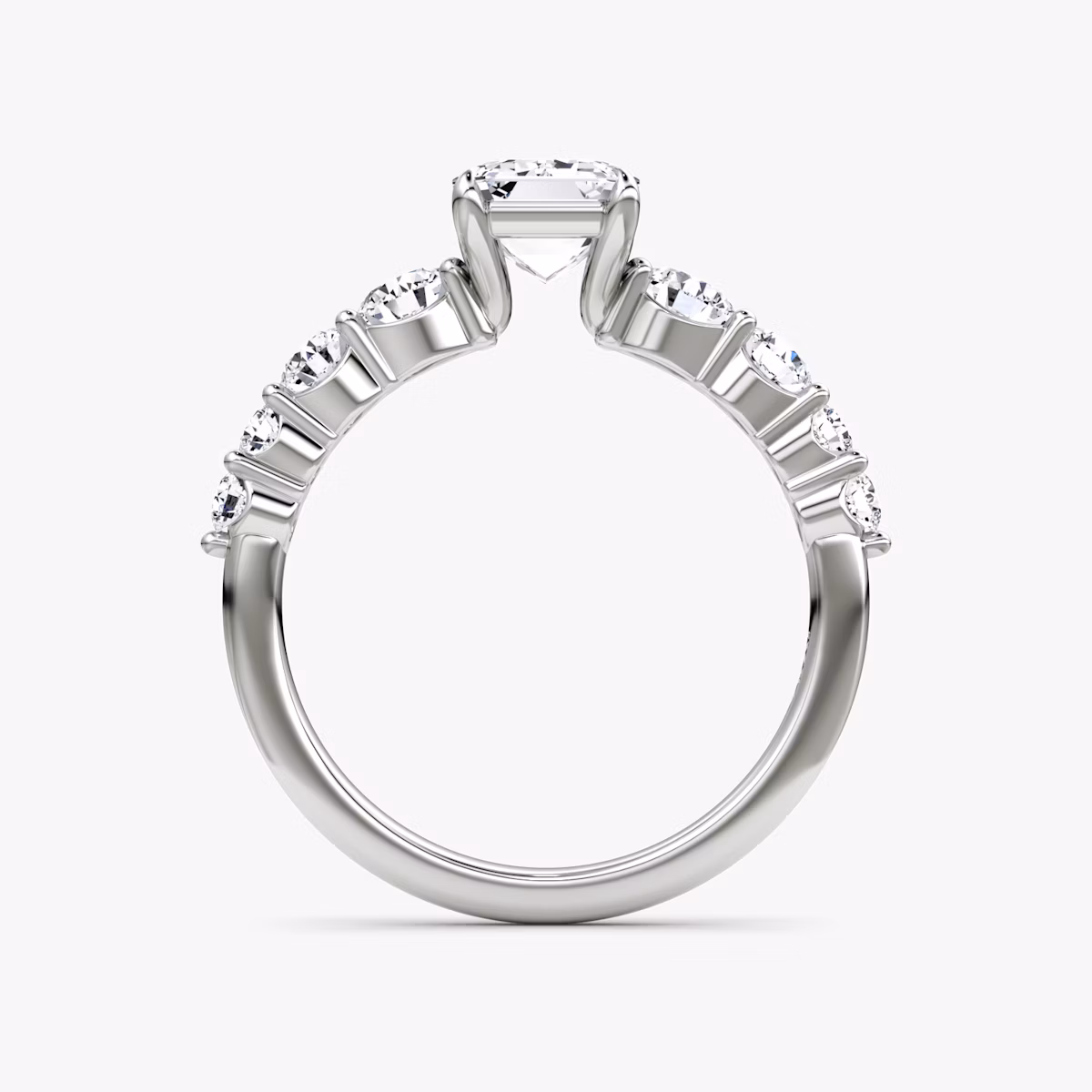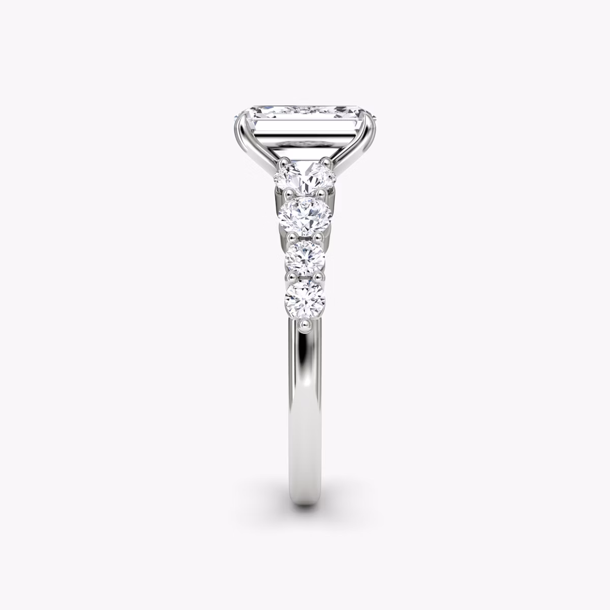 Four curved prongs caress the center stone while an array of eight VRAI created diamonds in graduated sizes appear to float alongside in the platinum or solid gold shared-prong setting. This diamond-forward take on a timeless setting is designed for maximal brilliance and ethereal elegance.