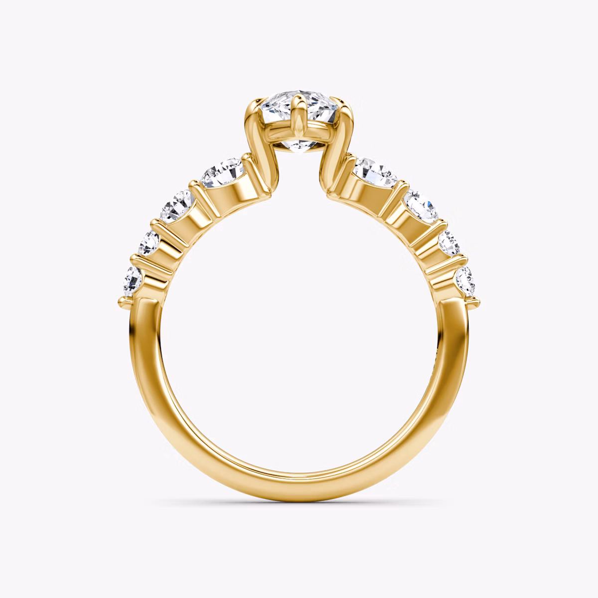 Four curved prongs caress the center stone while an array of eight VRAI created diamonds in graduated sizes appear to float alongside in the platinum or solid gold shared-prong setting. This diamond-forward take on a timeless setting is designed for maximal brilliance and ethereal elegance.