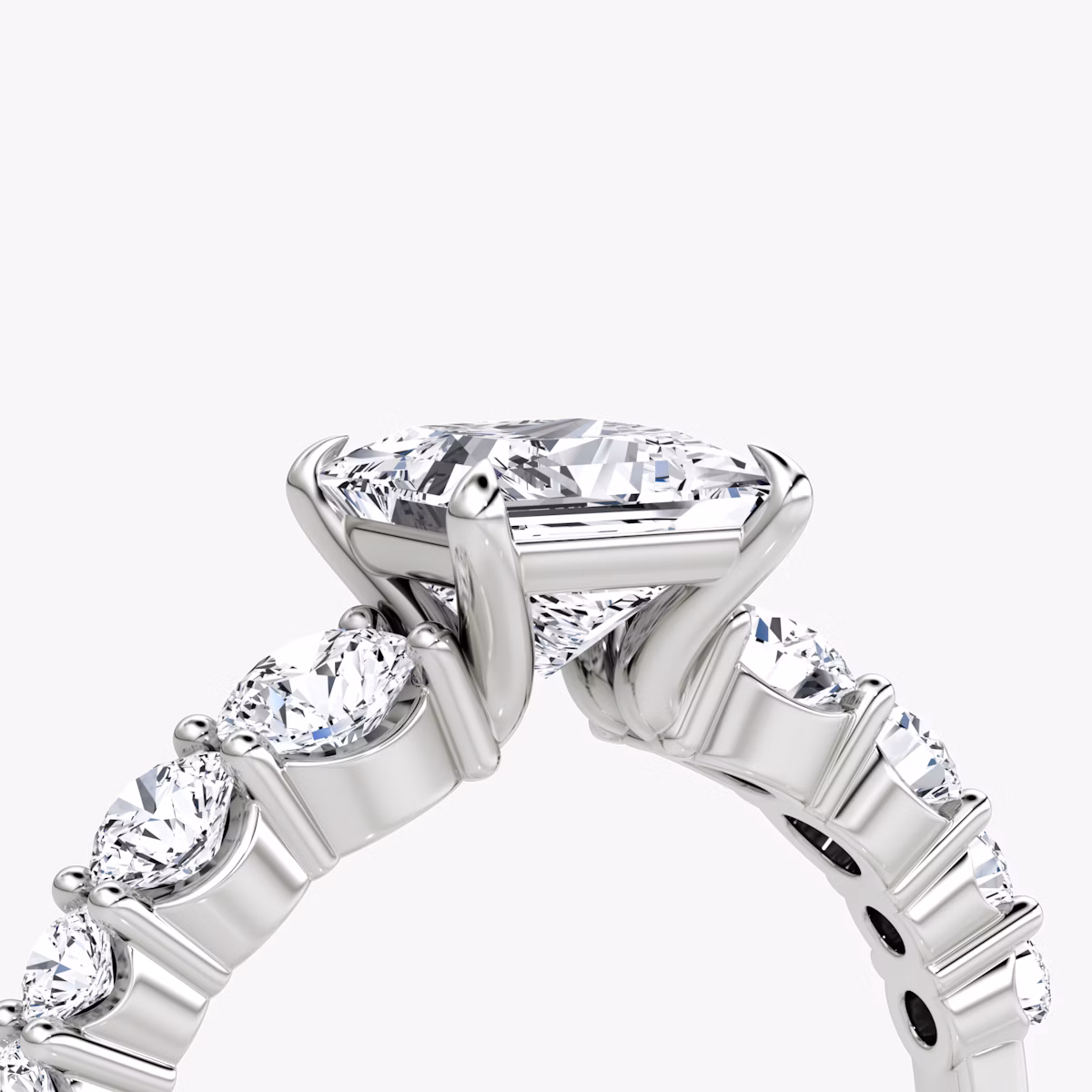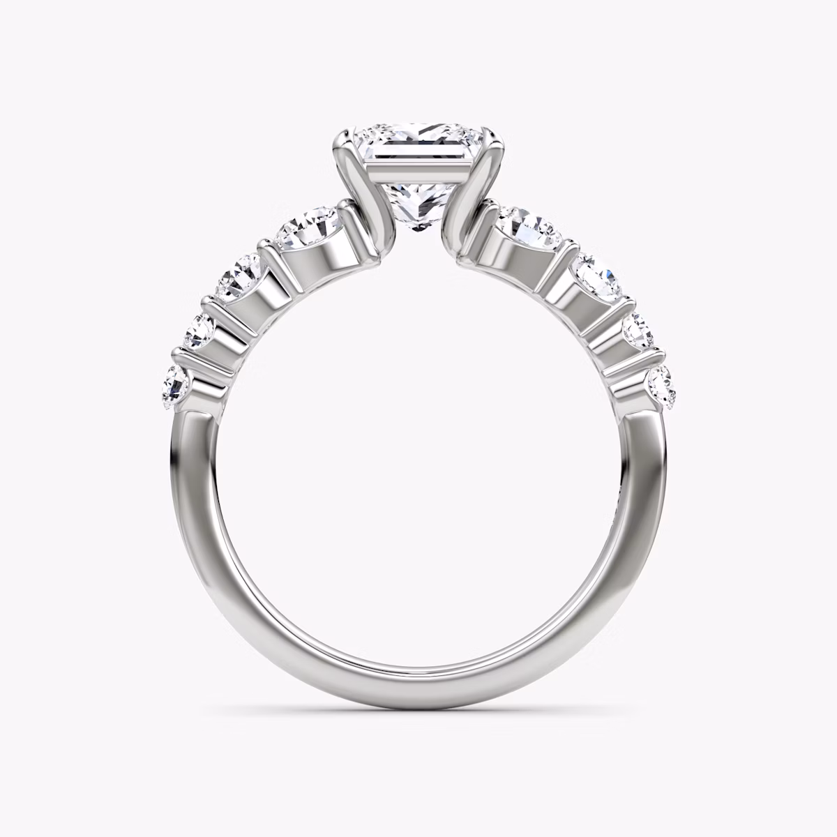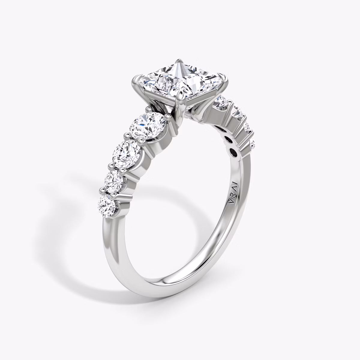 Four curved prongs caress the center stone while an array of eight VRAI created diamonds in graduated sizes appear to float alongside in the platinum or solid gold shared-prong setting. This diamond-forward take on a timeless setting is designed for maximal brilliance and ethereal elegance.