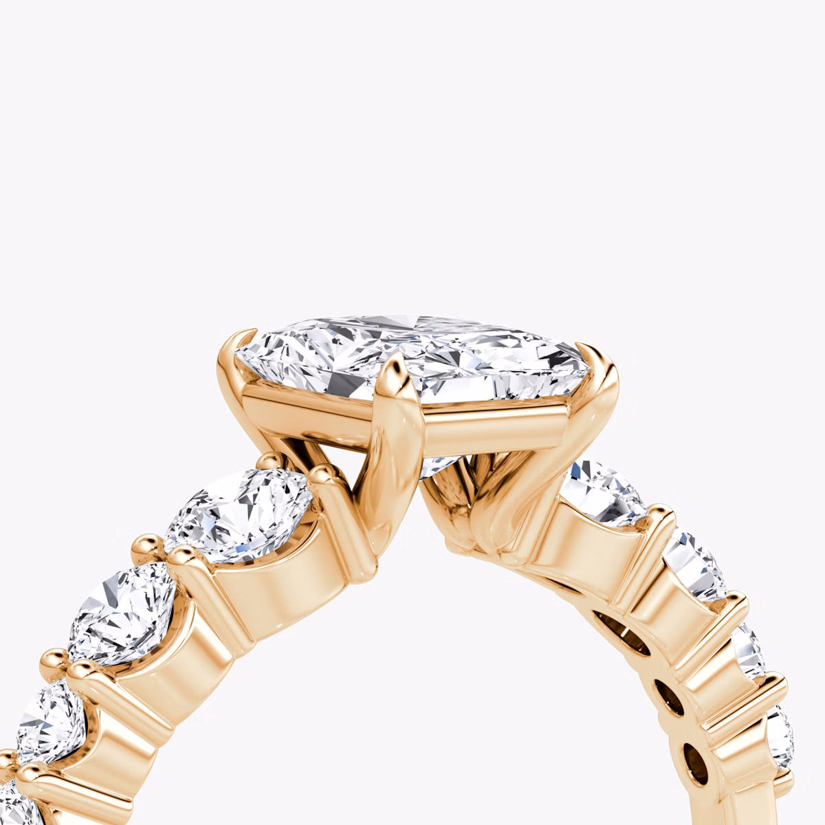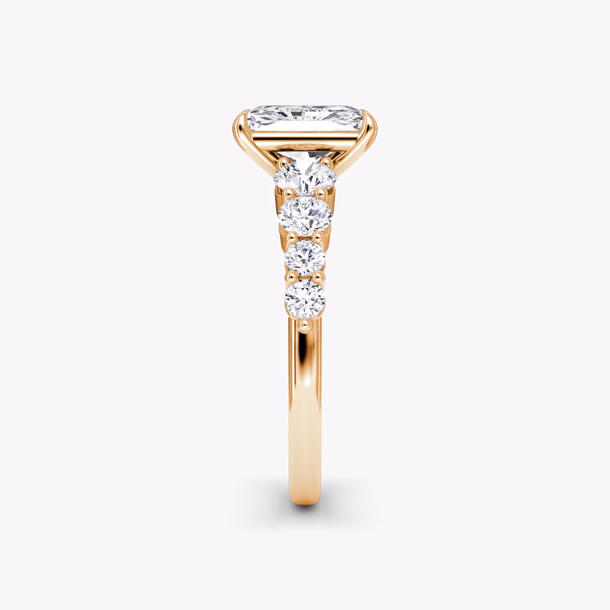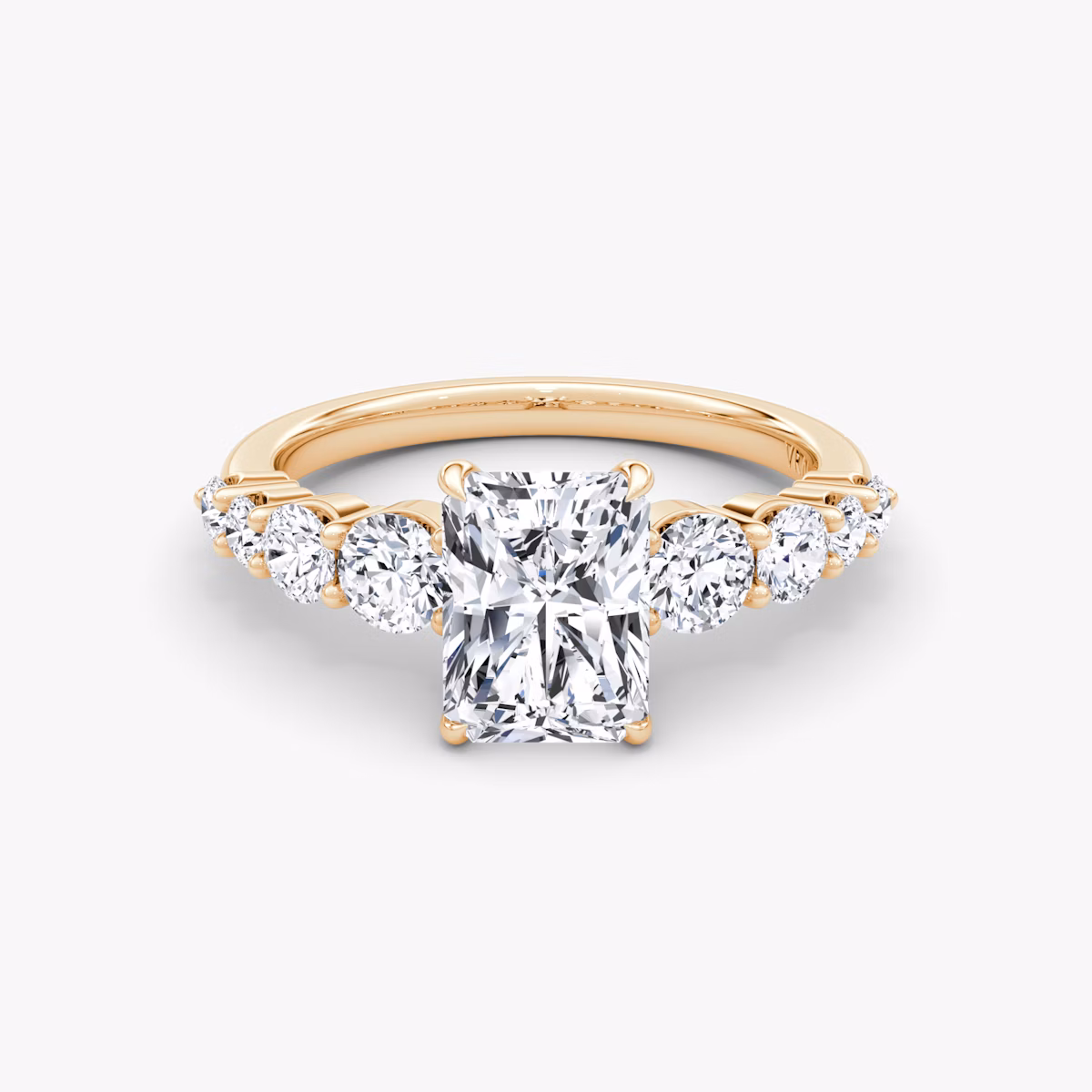 Four curved prongs caress the center stone while an array of eight VRAI created diamonds in graduated sizes appear to float alongside in the platinum or solid gold shared-prong setting. This diamond-forward take on a timeless setting is designed for maximal brilliance and ethereal elegance.