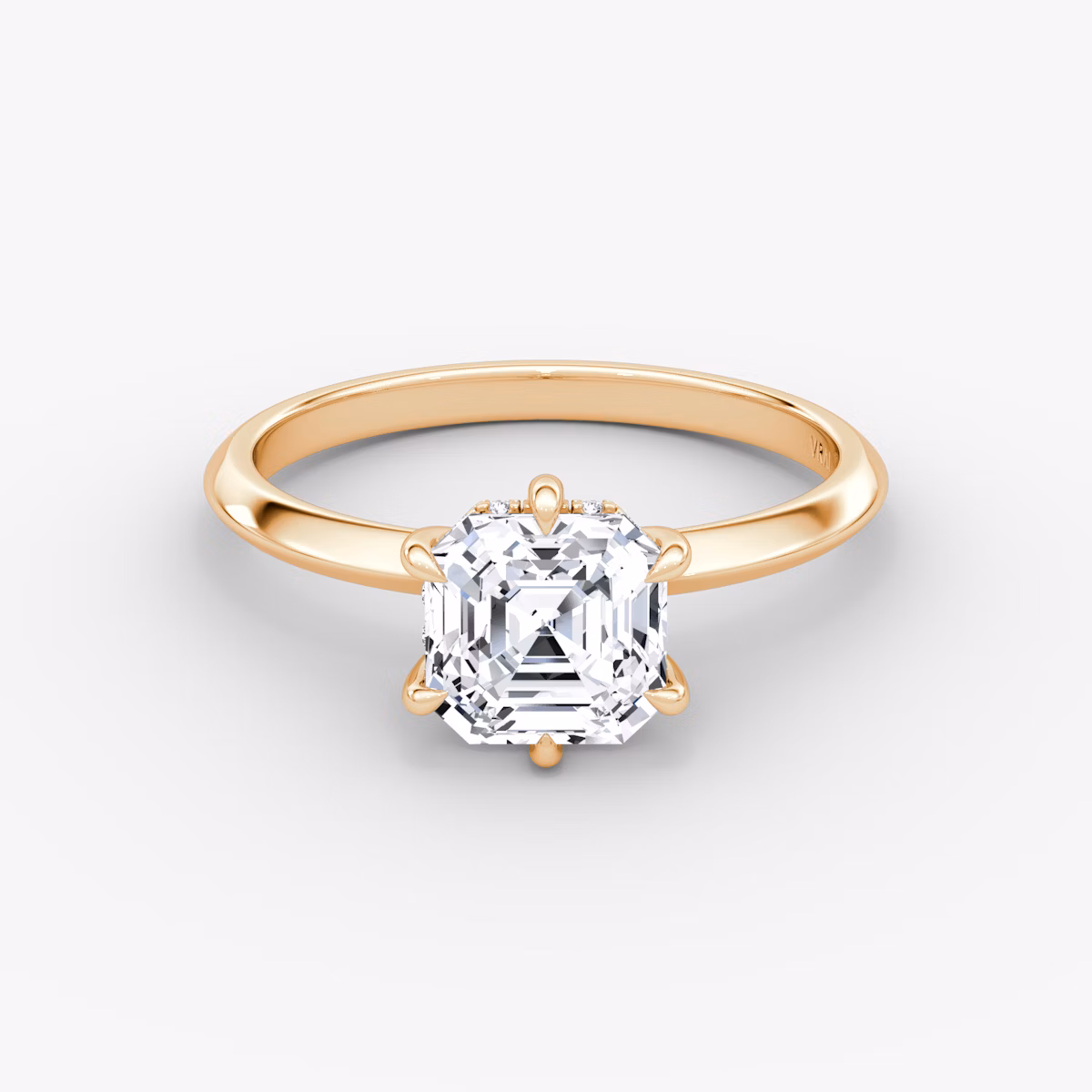 The Knife-Edge solitaire ring in rose gold with an asscher cut diamond and a hidden halo