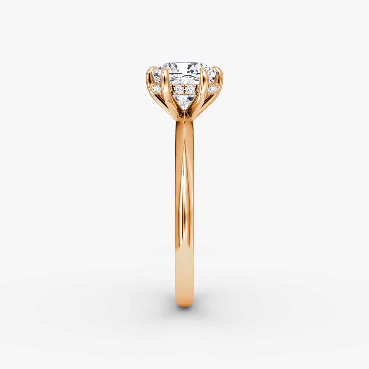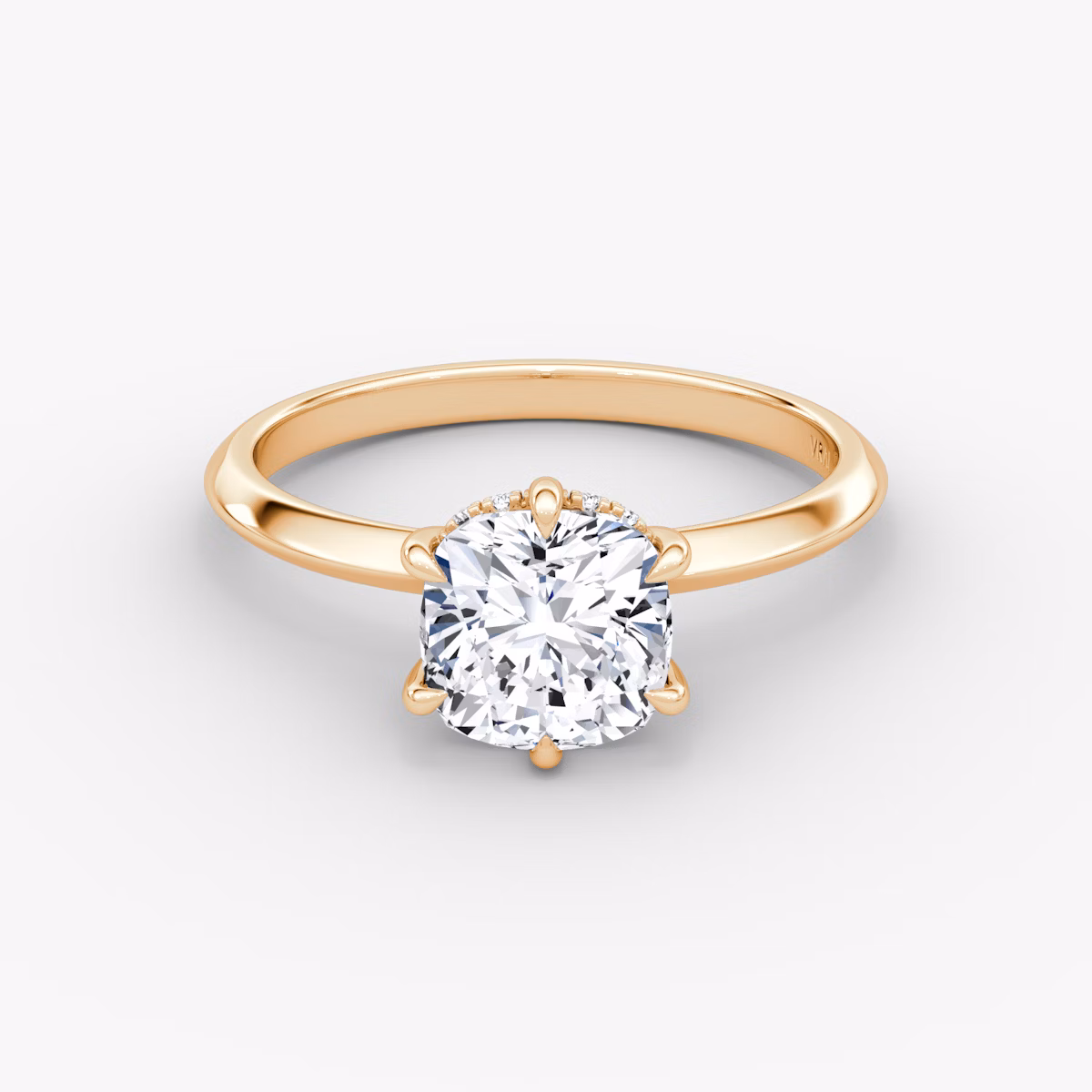 The Knife-Edge solitaire ring in rose gold with a cushion cut diamond and a hidden halo