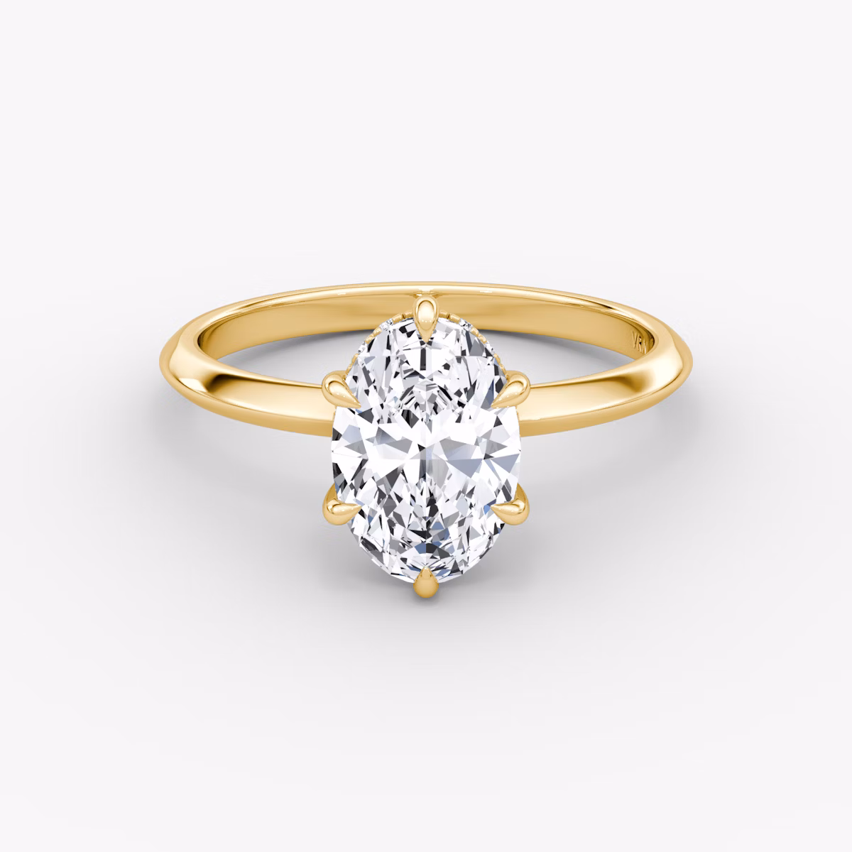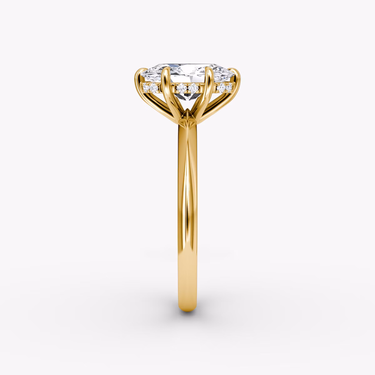 The Knife-Edge solitaire ring in yellow gold with an oval cut diamond and a hidden halo