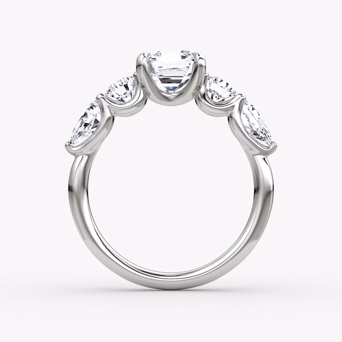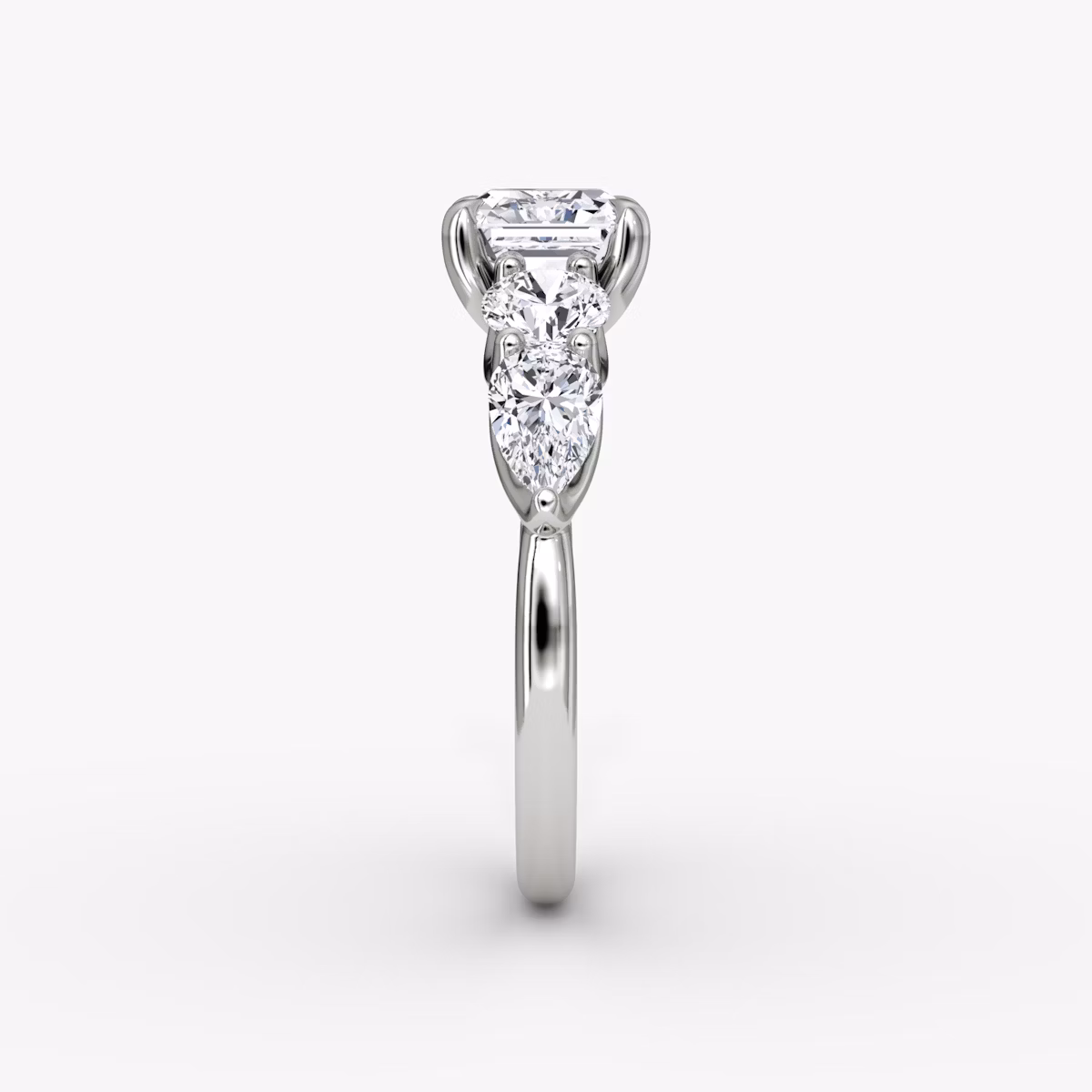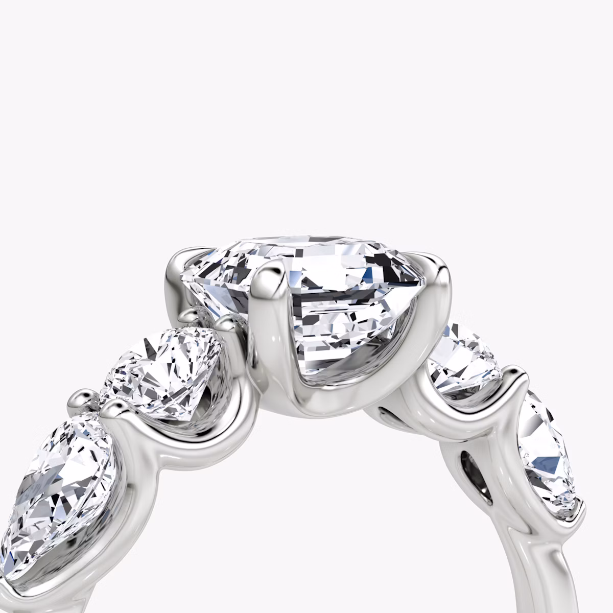The Mixed Shape engagement ring displays an array of five VRAI created diamonds of varying carat weights and diamond shapes. Choose between Round Brilliant and Pear side stones or Emerald and Round Brilliant side stones to uniquely spotlight your center VRAI created diamond. An instant classic, the Mixed Shape effortlessly blends differing diamond shapes and details to create an unforgettable design as unique as your love.