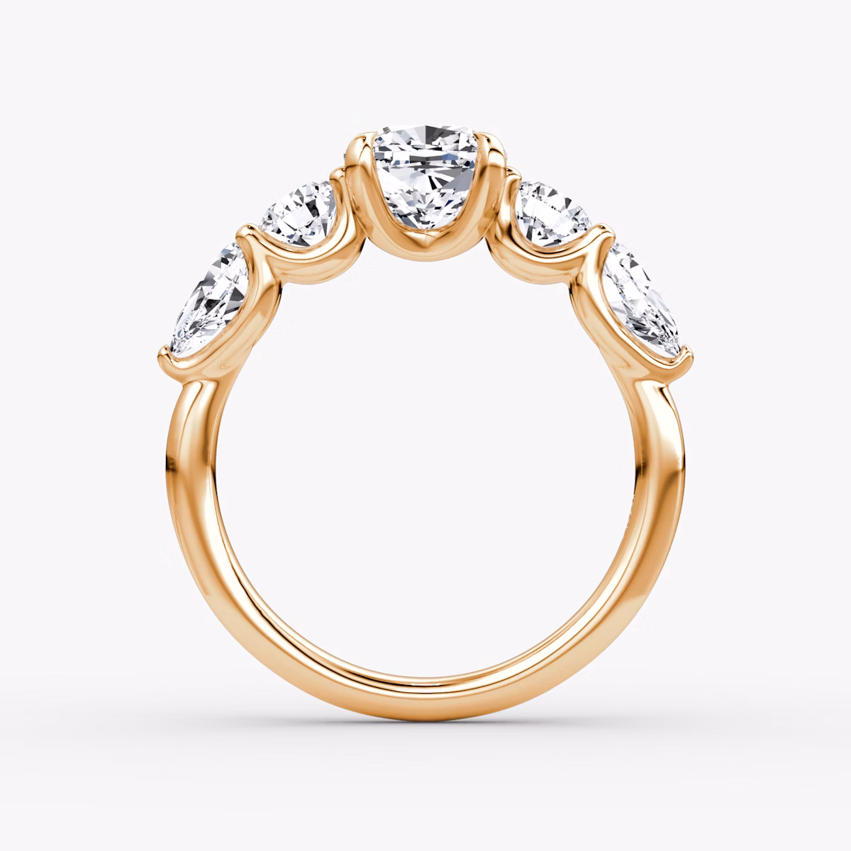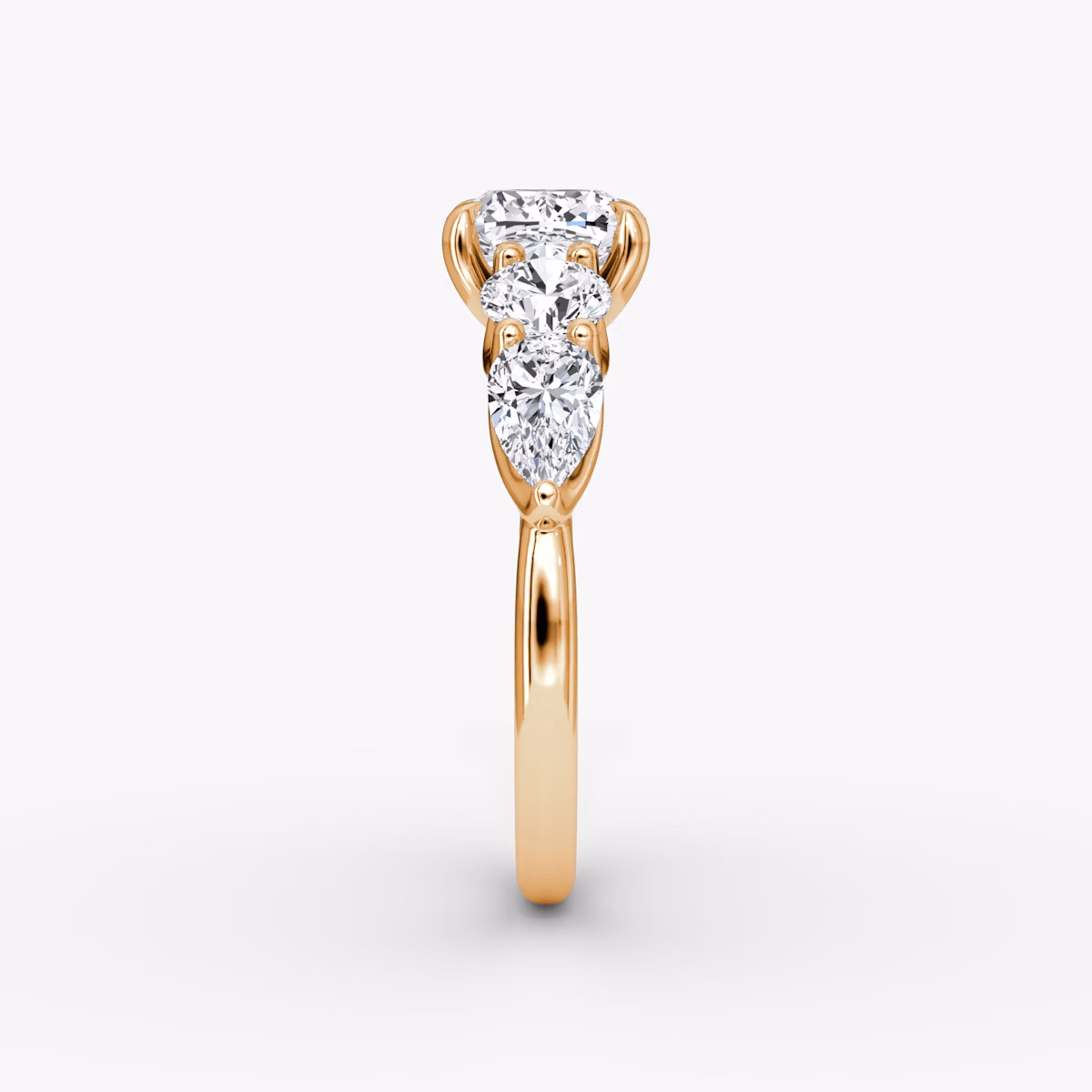 The Mixed Shape engagement ring displays an array of five VRAI created diamonds of varying carat weights and diamond shapes. Choose between Round Brilliant and Pear side stones or Emerald and Round Brilliant side stones to uniquely spotlight your center VRAI created diamond. An instant classic, the Mixed Shape effortlessly blends differing diamond shapes and details to create an unforgettable design as unique as your love.