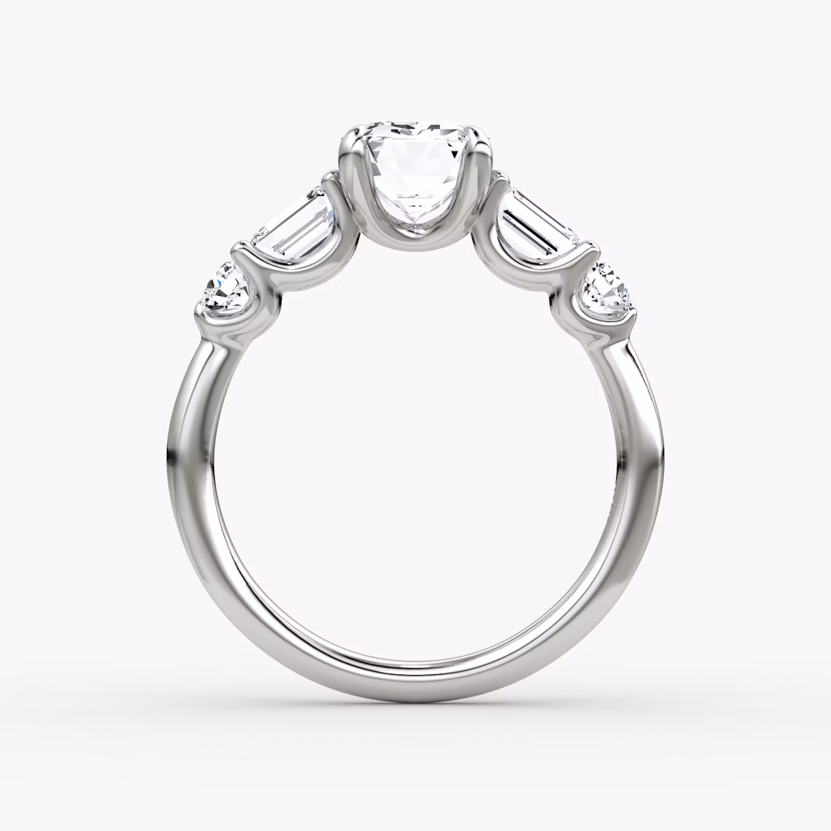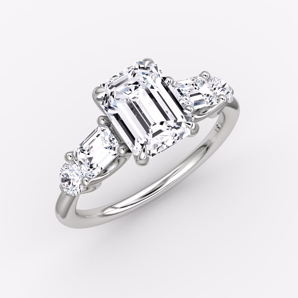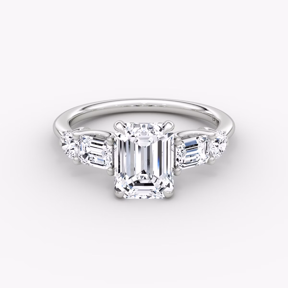 The Mixed Shape engagement ring displays an array of five VRAI created diamonds of varying carat weights and diamond shapes. Choose between Round Brilliant and Pear side stones or Emerald and Round Brilliant side stones to uniquely spotlight your center VRAI created diamond. An instant classic, the Mixed Shape effortlessly blends differing diamond shapes and details to create an unforgettable design as unique as your love.