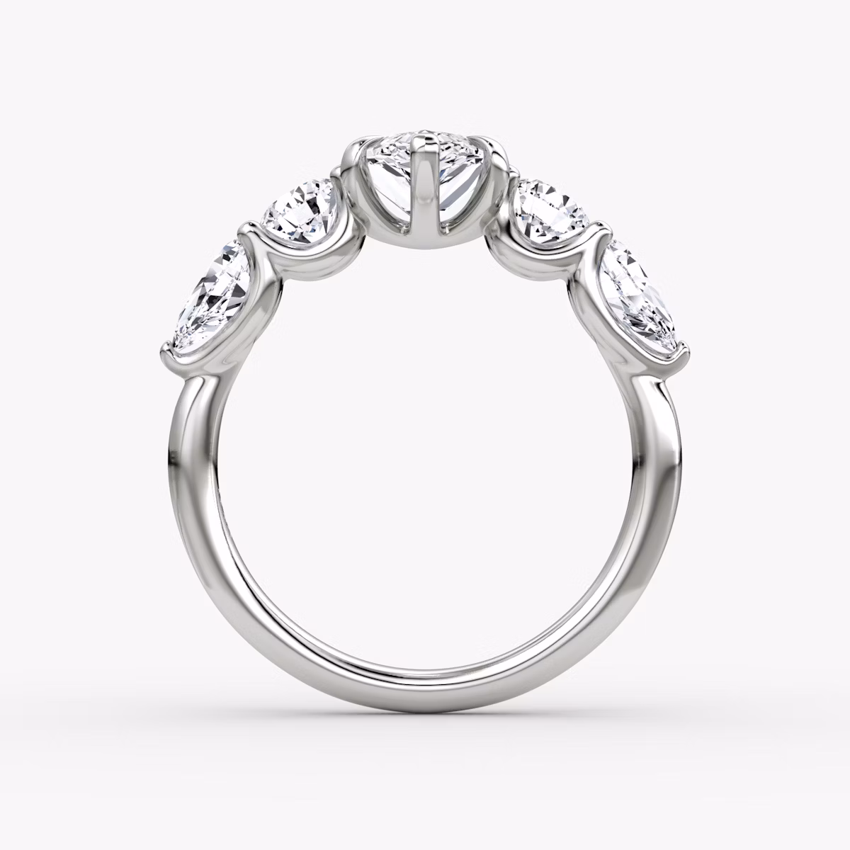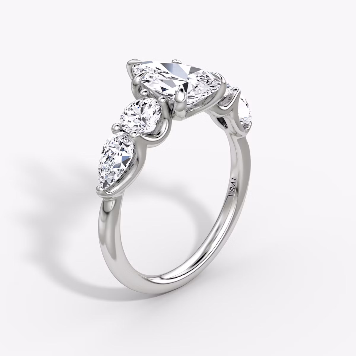 The Mixed Shape engagement ring displays an array of five VRAI created diamonds of varying carat weights and diamond shapes. Choose between Round Brilliant and Pear side stones or Emerald and Round Brilliant side stones to uniquely spotlight your center VRAI created diamond. An instant classic, the Mixed Shape effortlessly blends differing diamond shapes and details to create an unforgettable design as unique as your love.