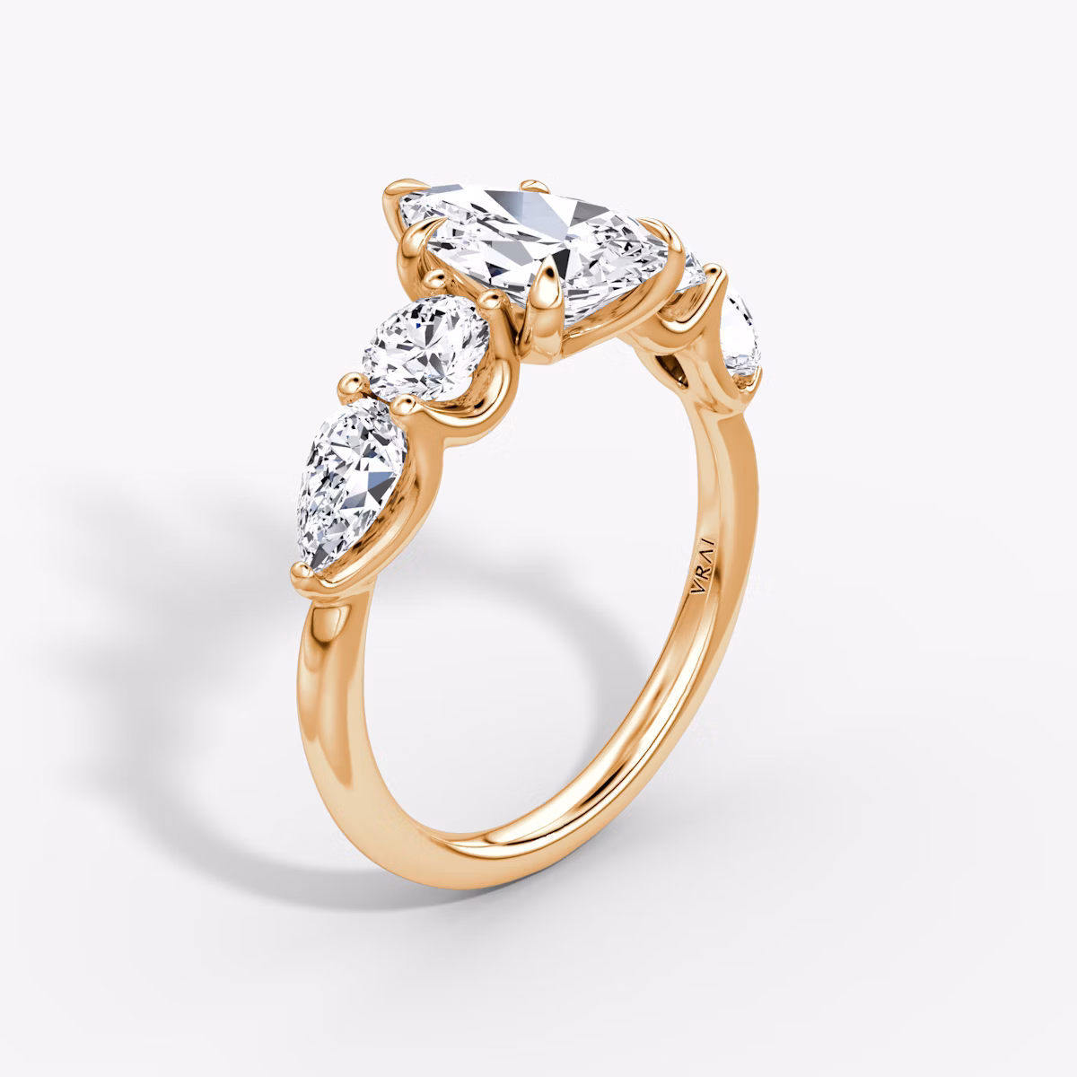 The Mixed Shape engagement ring displays an array of five VRAI created diamonds of varying carat weights and diamond shapes. Choose between Round Brilliant and Pear side stones or Emerald and Round Brilliant side stones to uniquely spotlight your center VRAI created diamond. An instant classic, the Mixed Shape effortlessly blends differing diamond shapes and details to create an unforgettable design as unique as your love.