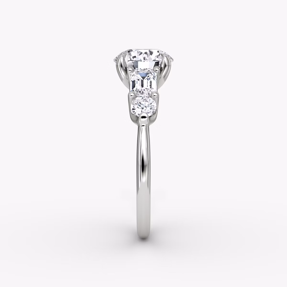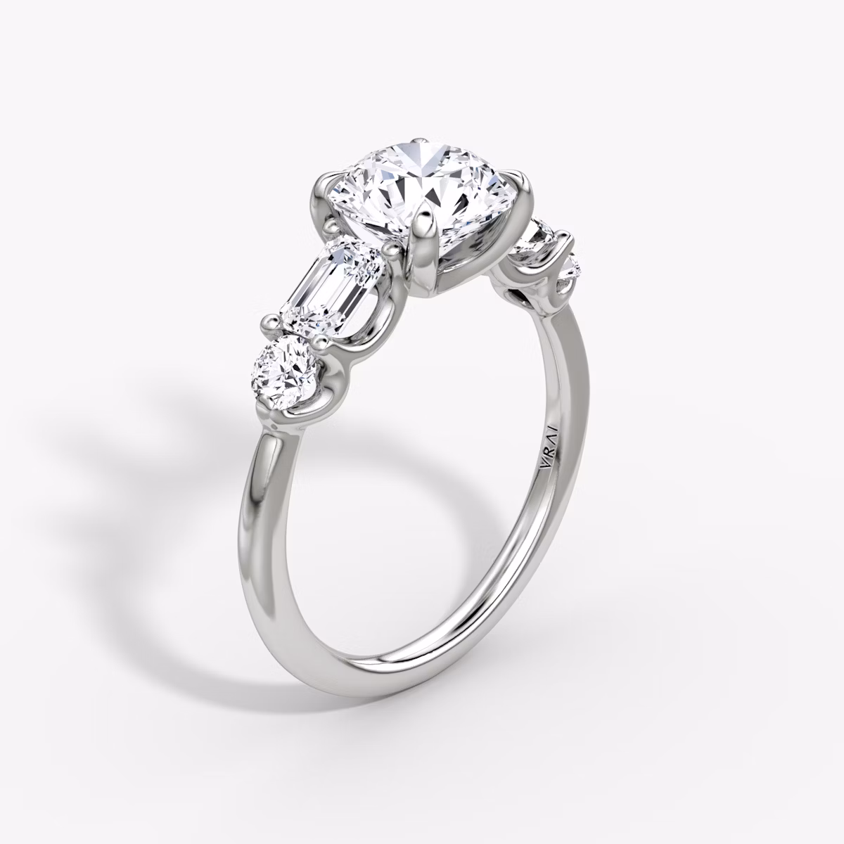 The Mixed Shape engagement ring displays an array of five VRAI created diamonds of varying carat weights and diamond shapes. Choose between Round Brilliant and Pear side stones or Emerald and Round Brilliant side stones to uniquely spotlight your center VRAI created diamond. An instant classic, the Mixed Shape effortlessly blends differing diamond shapes and details to create an unforgettable design as unique as your love.