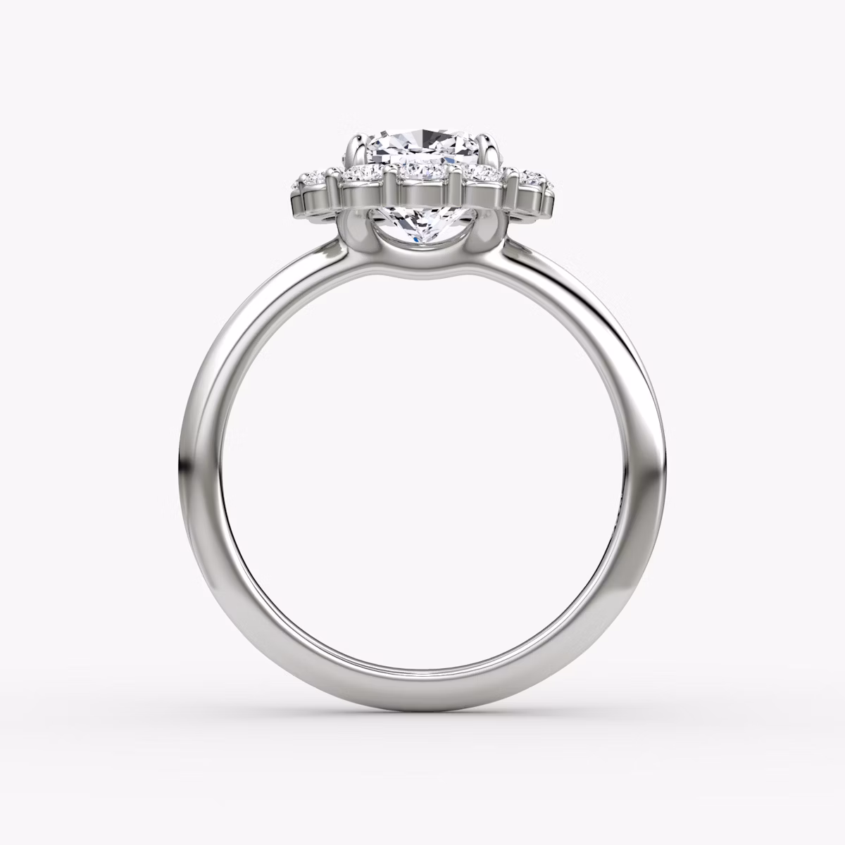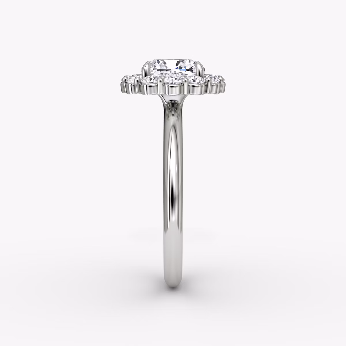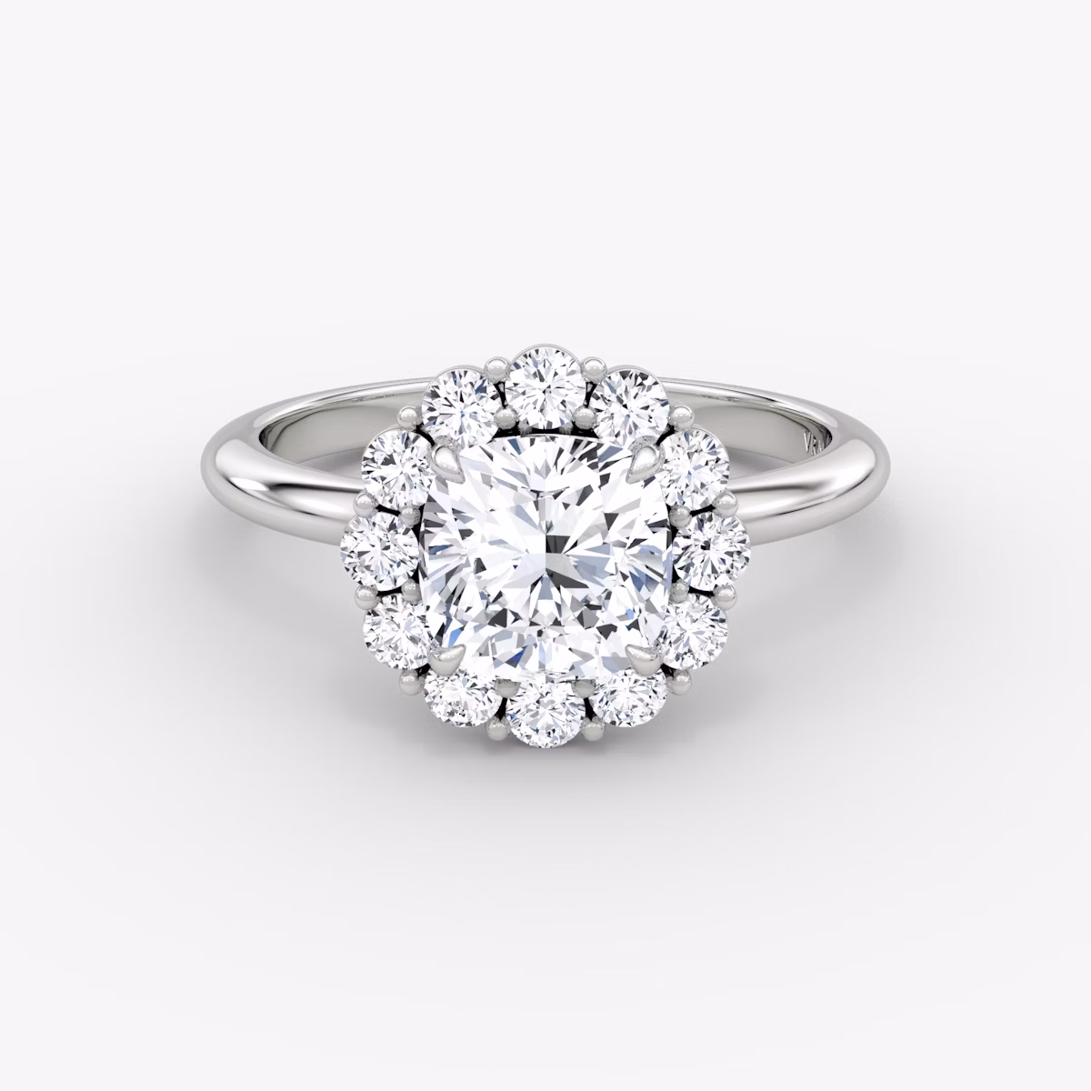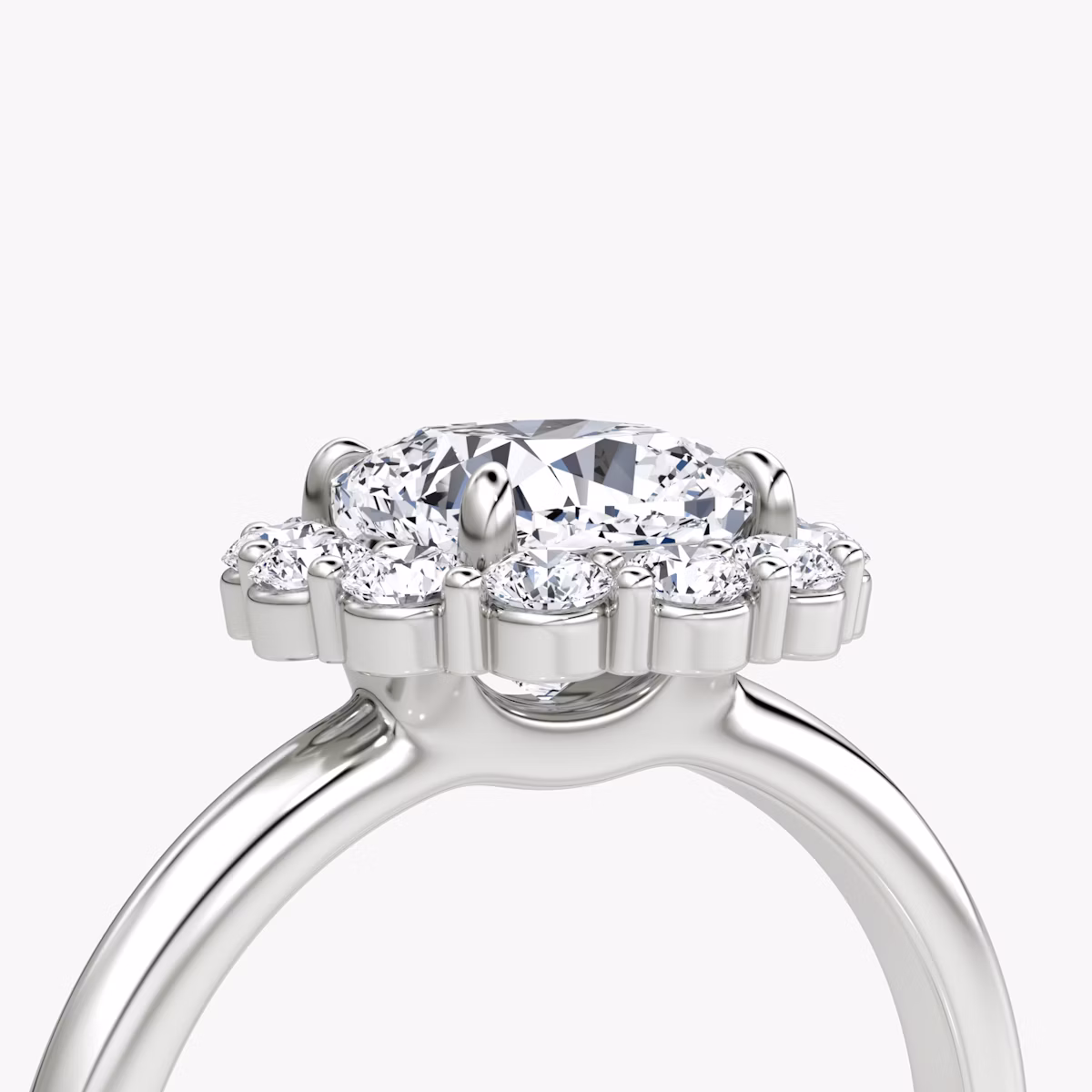 The Signature Floral Halo engagement ring in platinum with a cushion diamond