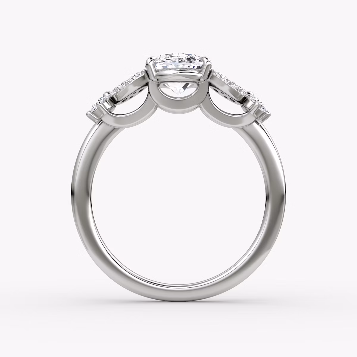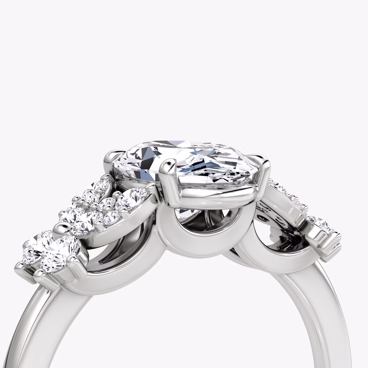 A nature-inspired take on our most sought-after setting. The signature sling dips slightly below the band, securing your VRAI created diamond in place while drawing in the light. Round side stones form petals on either side for a thoroughly floral look.