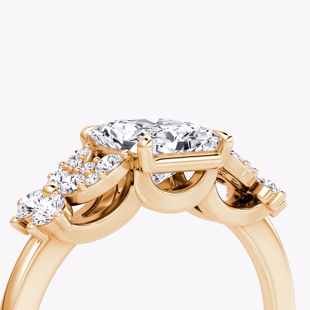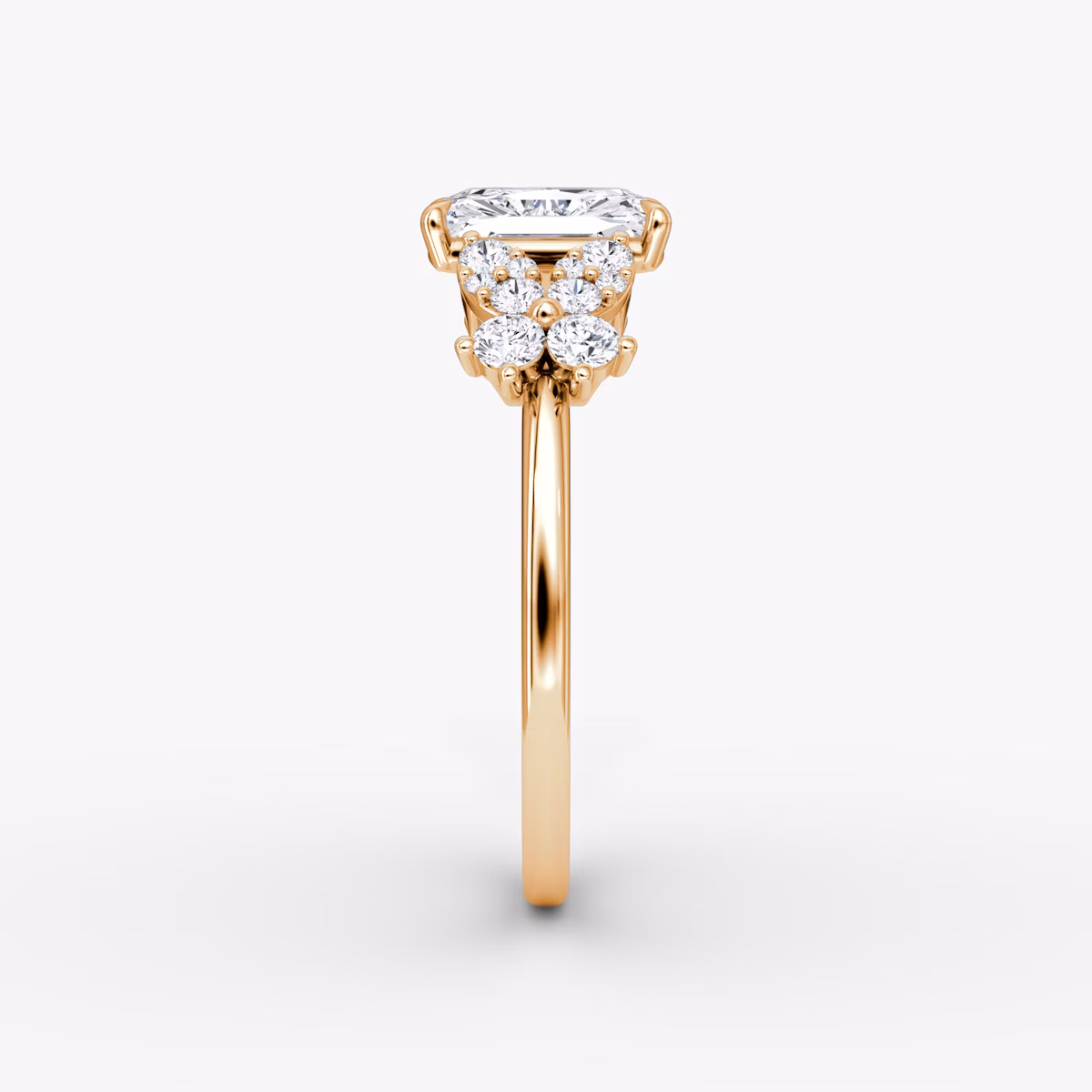 A nature-inspired take on our most sought-after setting. The signature sling dips slightly below the band, securing your VRAI created diamond in place while drawing in the light. Round side stones form petals on either side for a thoroughly floral look.