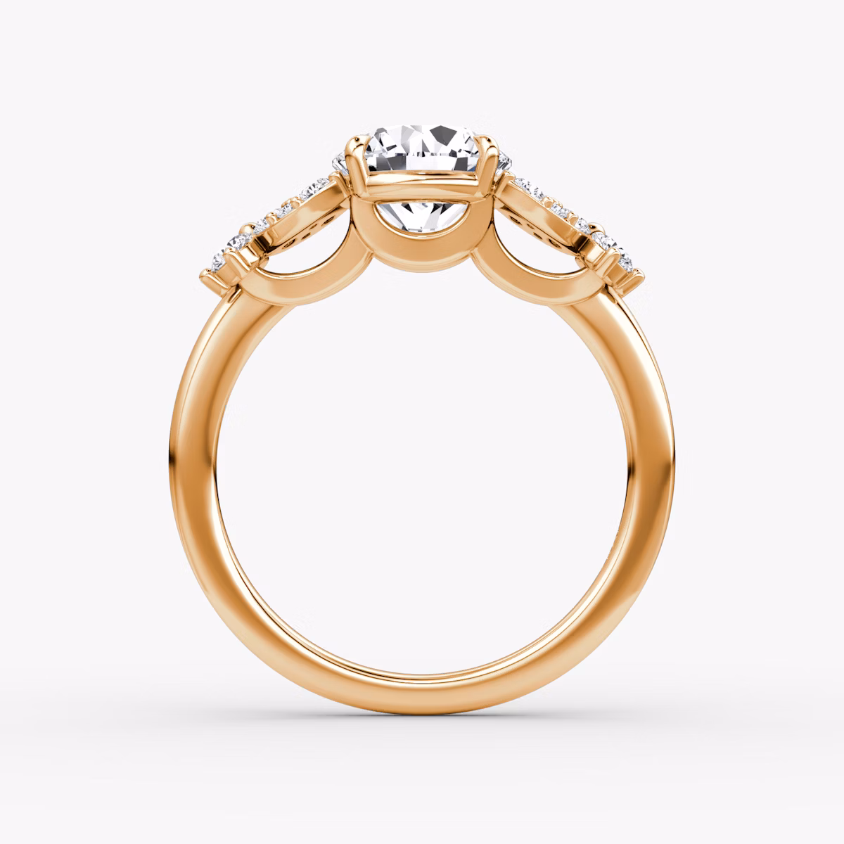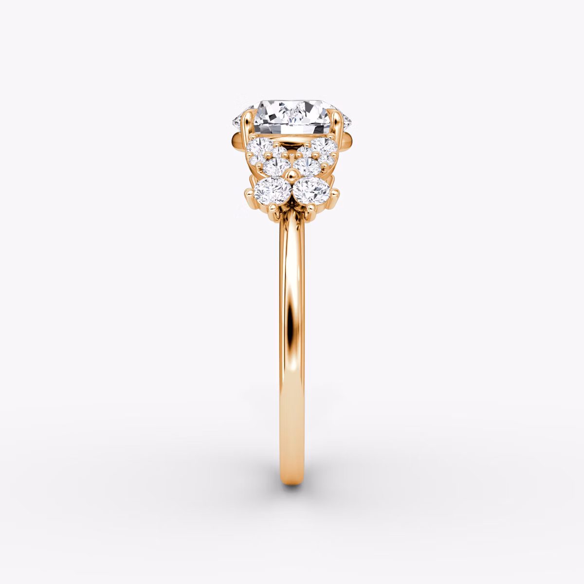 A nature-inspired take on our most sought-after setting. The signature sling dips slightly below the band, securing your VRAI created diamond in place while drawing in the light. Round side stones form petals on either side for a thoroughly floral look.