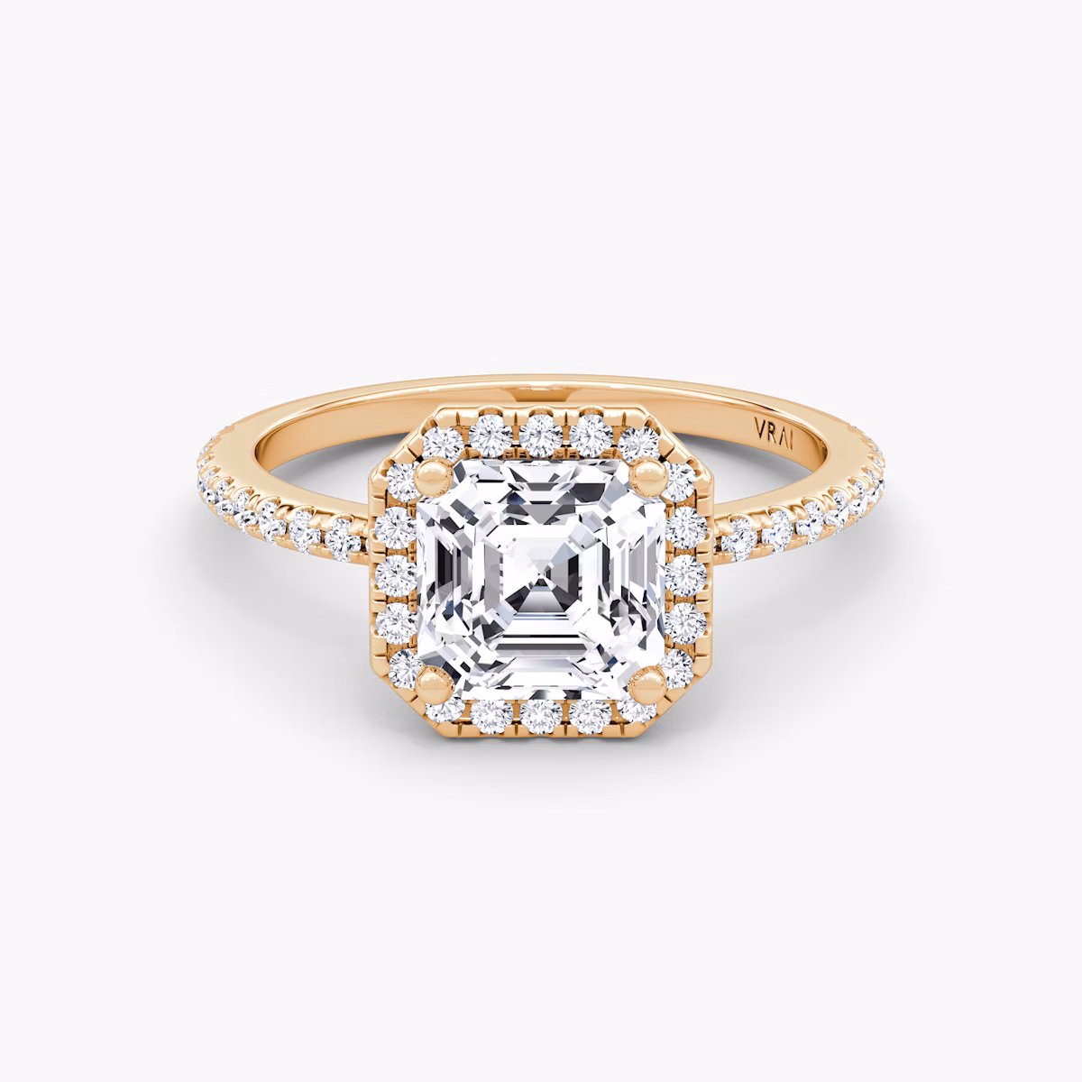 The Halo engagement ring is our rendition of a classically romantic setting. A radiant series of individually handset pavé VRAI created diamonds accent the brilliance of your center stone. Thoughtfully designed to sit low on your finger and flush with your wedding band, our signature sling dips slightly below the band, drawing in light so your VRAI created diamond shines bright.