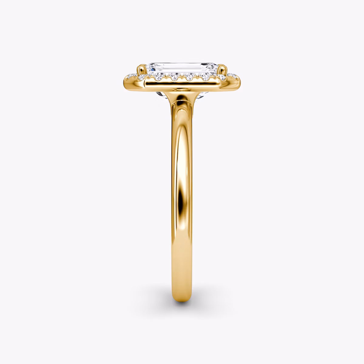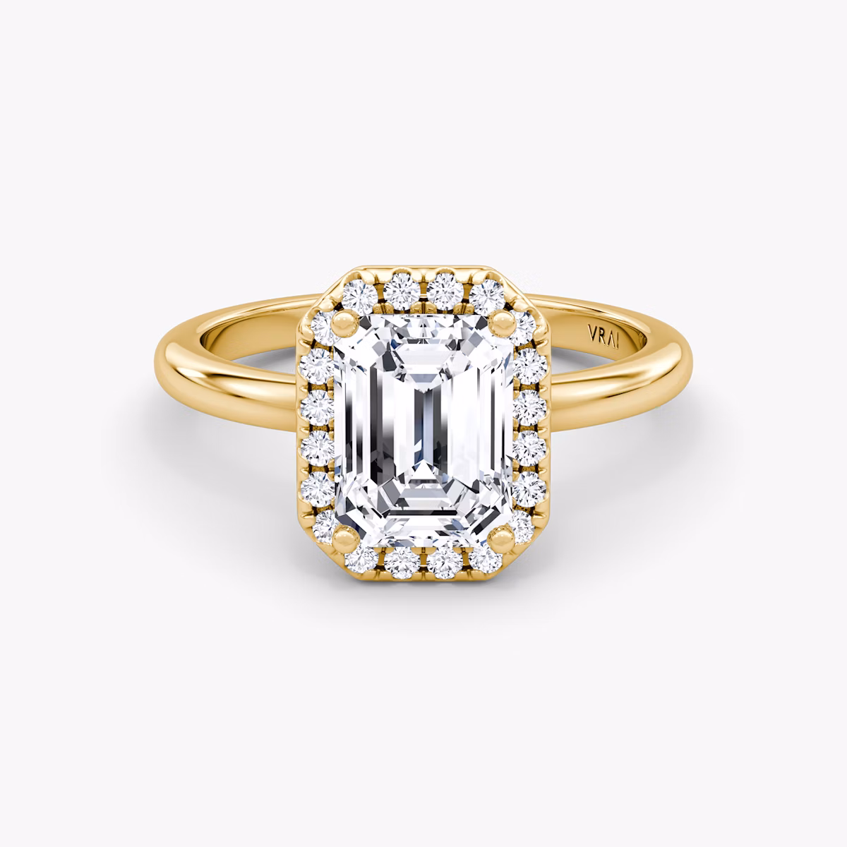 The Halo engagement ring is our rendition of a classically romantic setting. A radiant series of individually handset pavé VRAI created diamonds accent the brilliance of your center stone. Thoughtfully designed to sit low on your finger and flush with your wedding band, our signature sling dips slightly below the band, drawing in light so your VRAI created diamond shines bright.