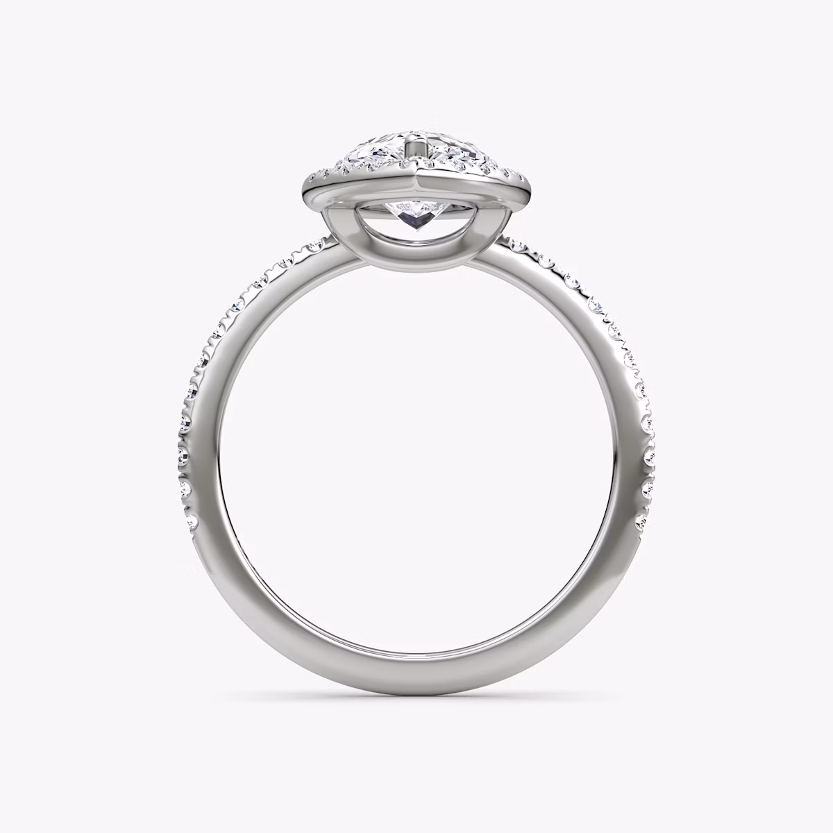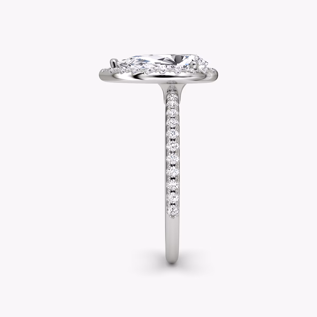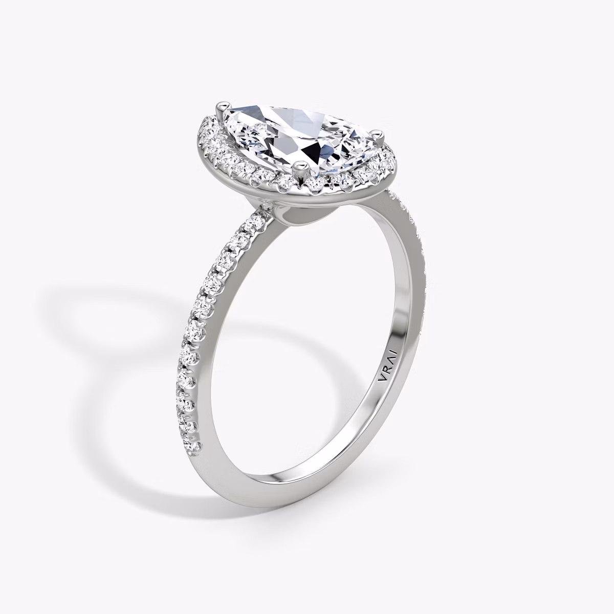 The Halo engagement ring is our rendition of a classically romantic setting. A radiant series of individually handset pavé VRAI created diamonds accent the brilliance of your center stone. Thoughtfully designed to sit low on your finger and flush with your wedding band, our signature sling dips slightly below the band, drawing in light so your VRAI created diamond shines bright.