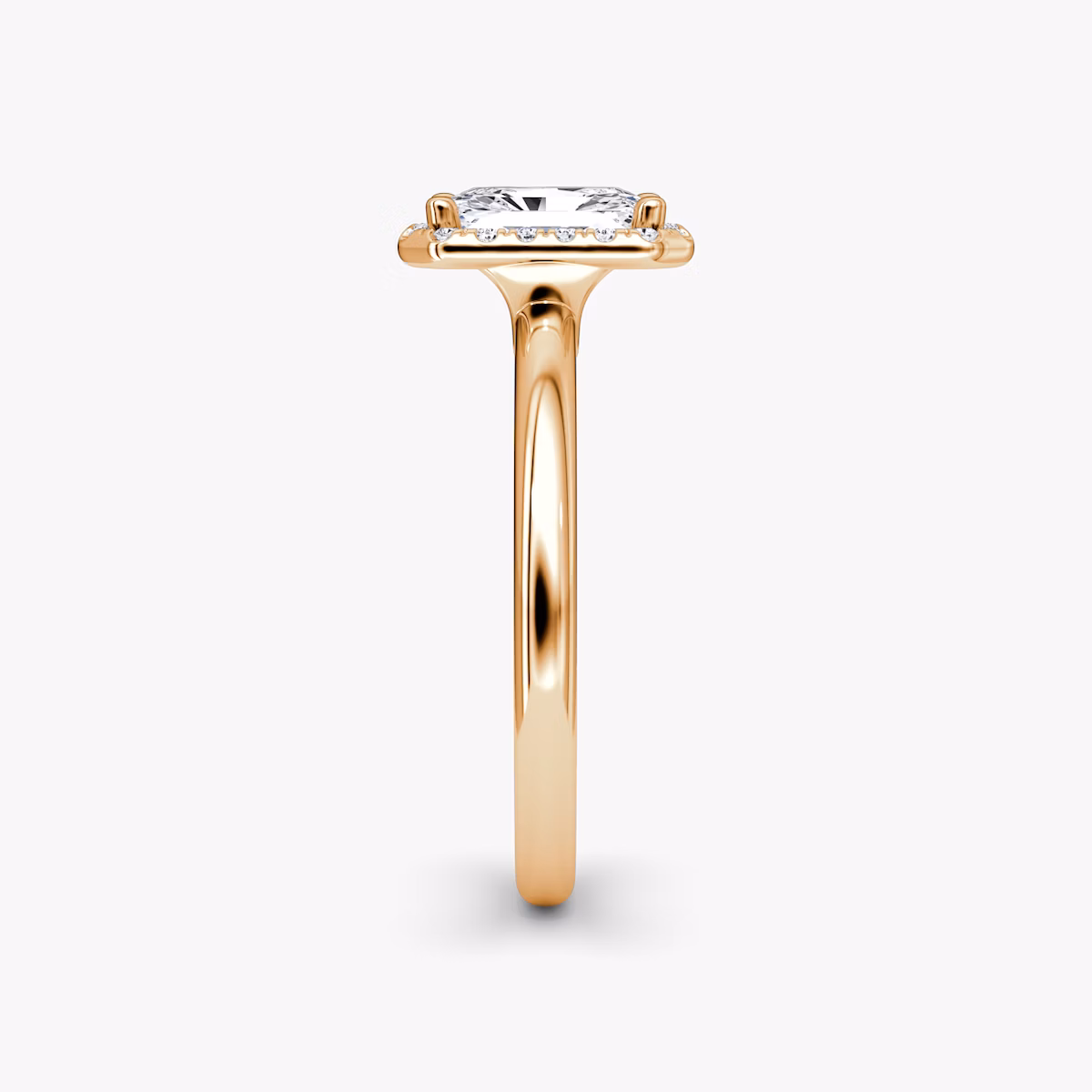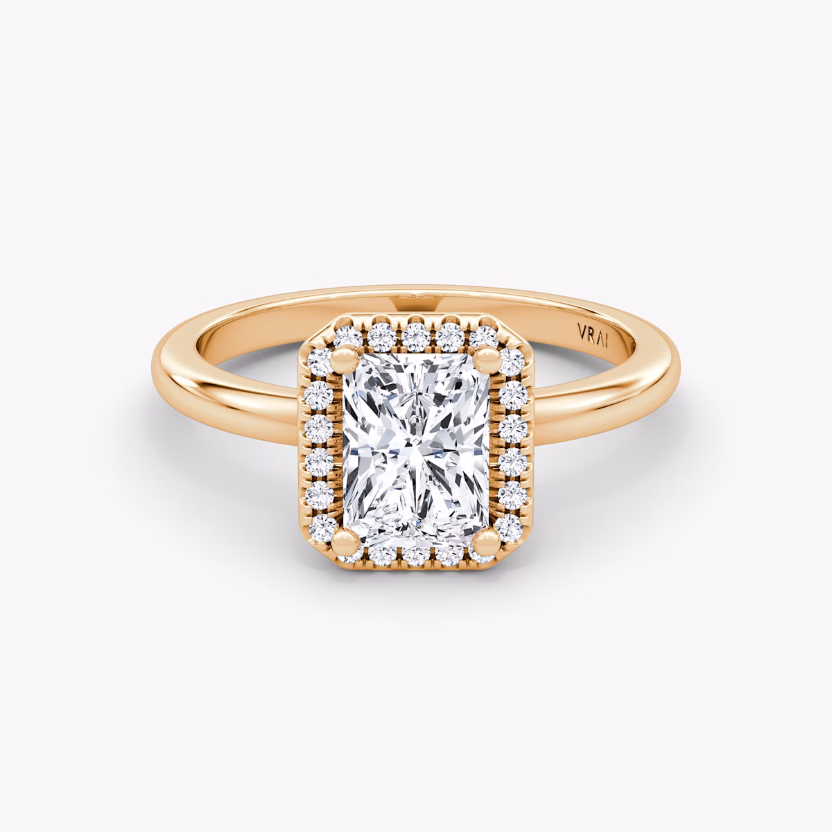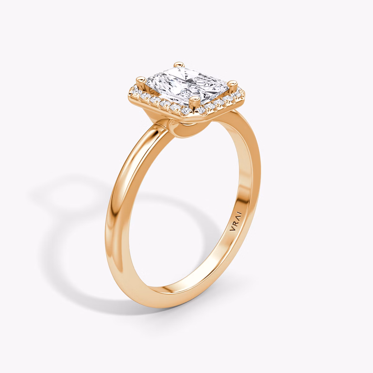 The Halo engagement ring is our rendition of a classically romantic setting. A radiant series of individually handset pavé VRAI created diamonds accent the brilliance of your center stone. Thoughtfully designed to sit low on your finger and flush with your wedding band, our signature sling dips slightly below the band, drawing in light so your VRAI created diamond shines bright.