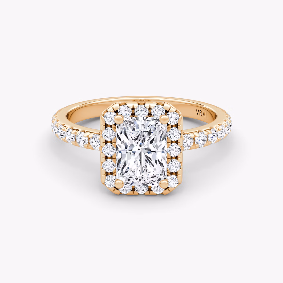 The Halo engagement ring is our rendition of a classically romantic setting. A radiant series of individually handset pavé VRAI created diamonds accent the brilliance of your center stone. Thoughtfully designed to sit low on your finger and flush with your wedding band, our signature sling dips slightly below the band, drawing in light so your VRAI created diamond shines bright.