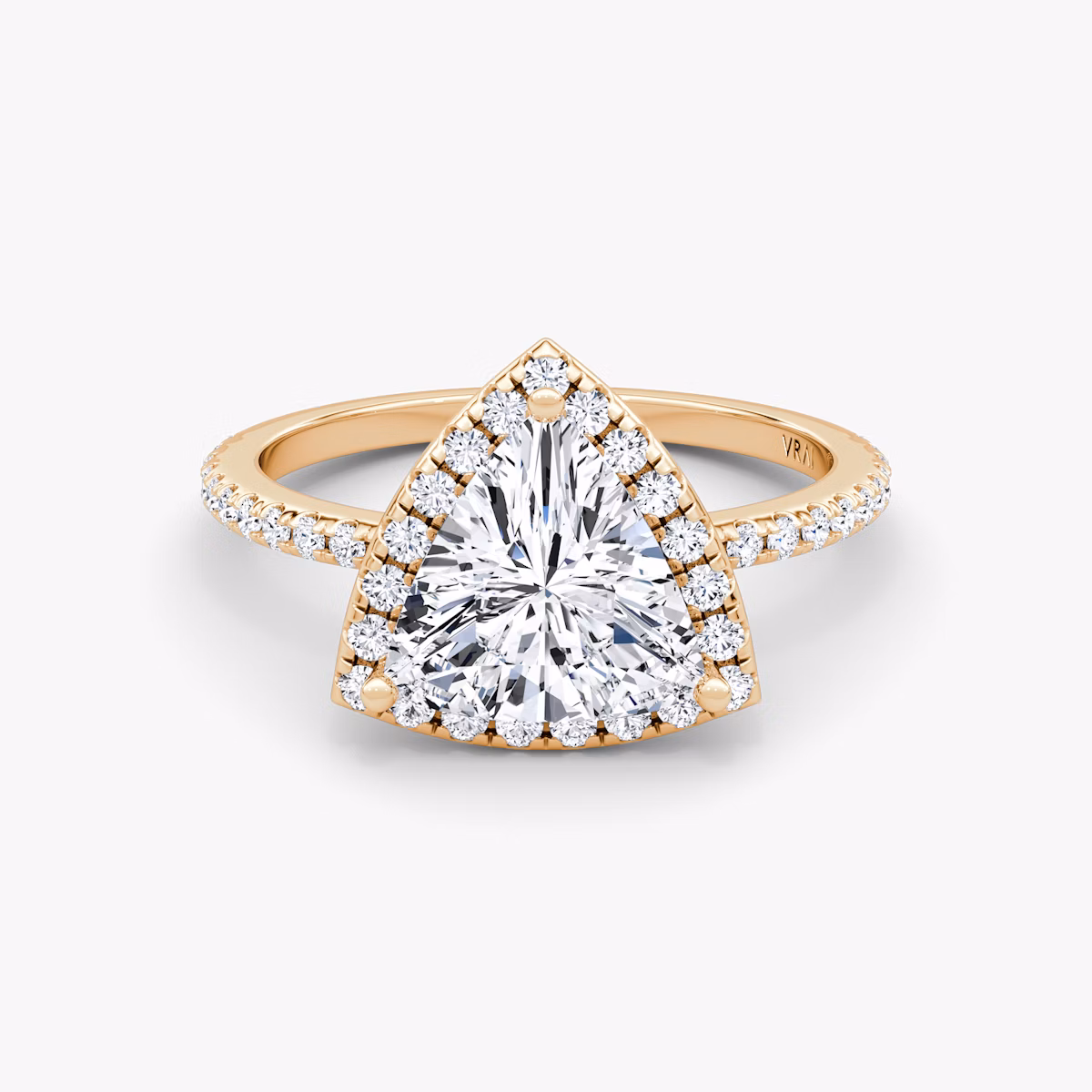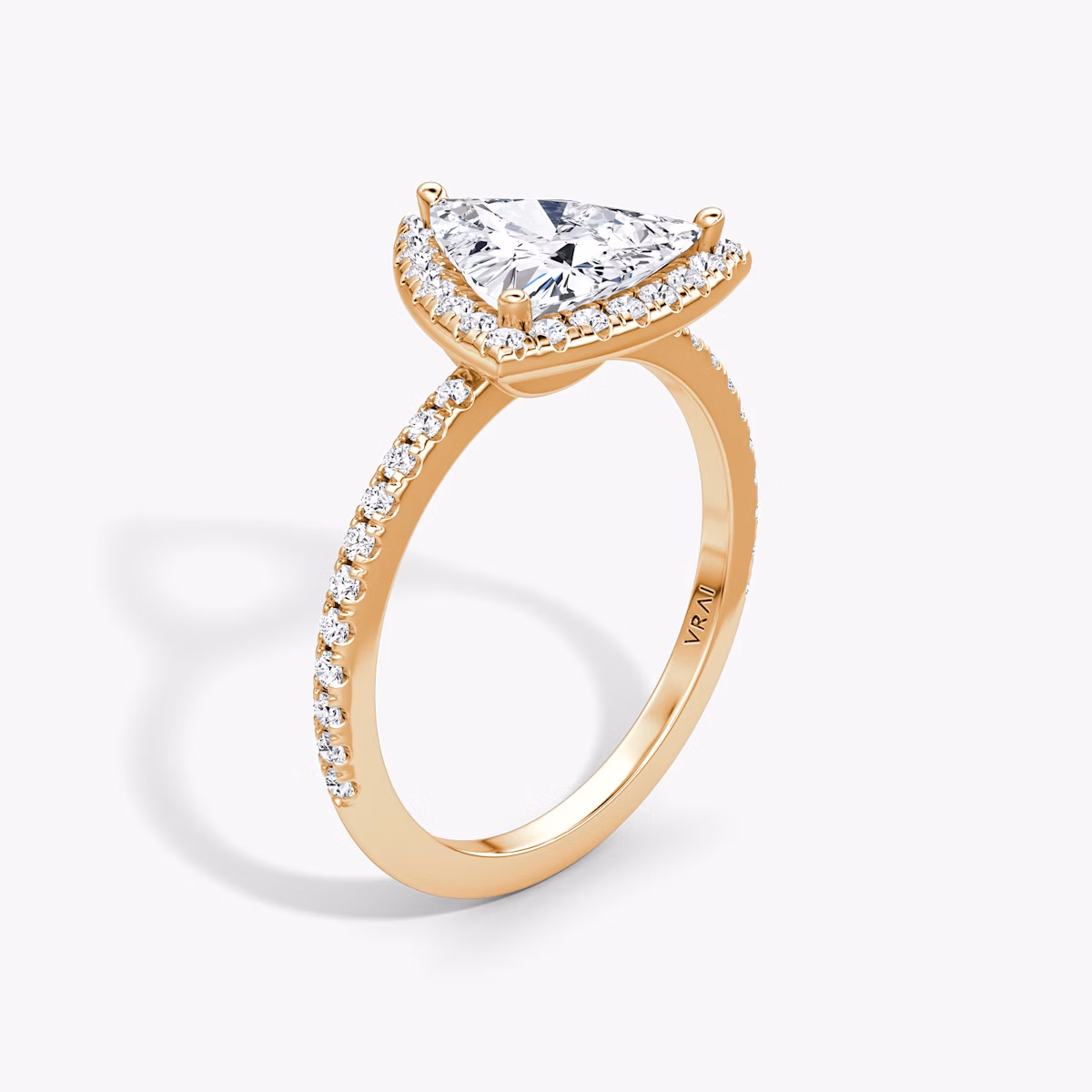The Halo engagement ring is our rendition of a classically romantic setting. A radiant series of individually handset pavé VRAI created diamonds accent the brilliance of your center stone. Thoughtfully designed to sit low on your finger and flush with your wedding band, our signature sling dips slightly below the band, drawing in light so your VRAI created diamond shines bright.