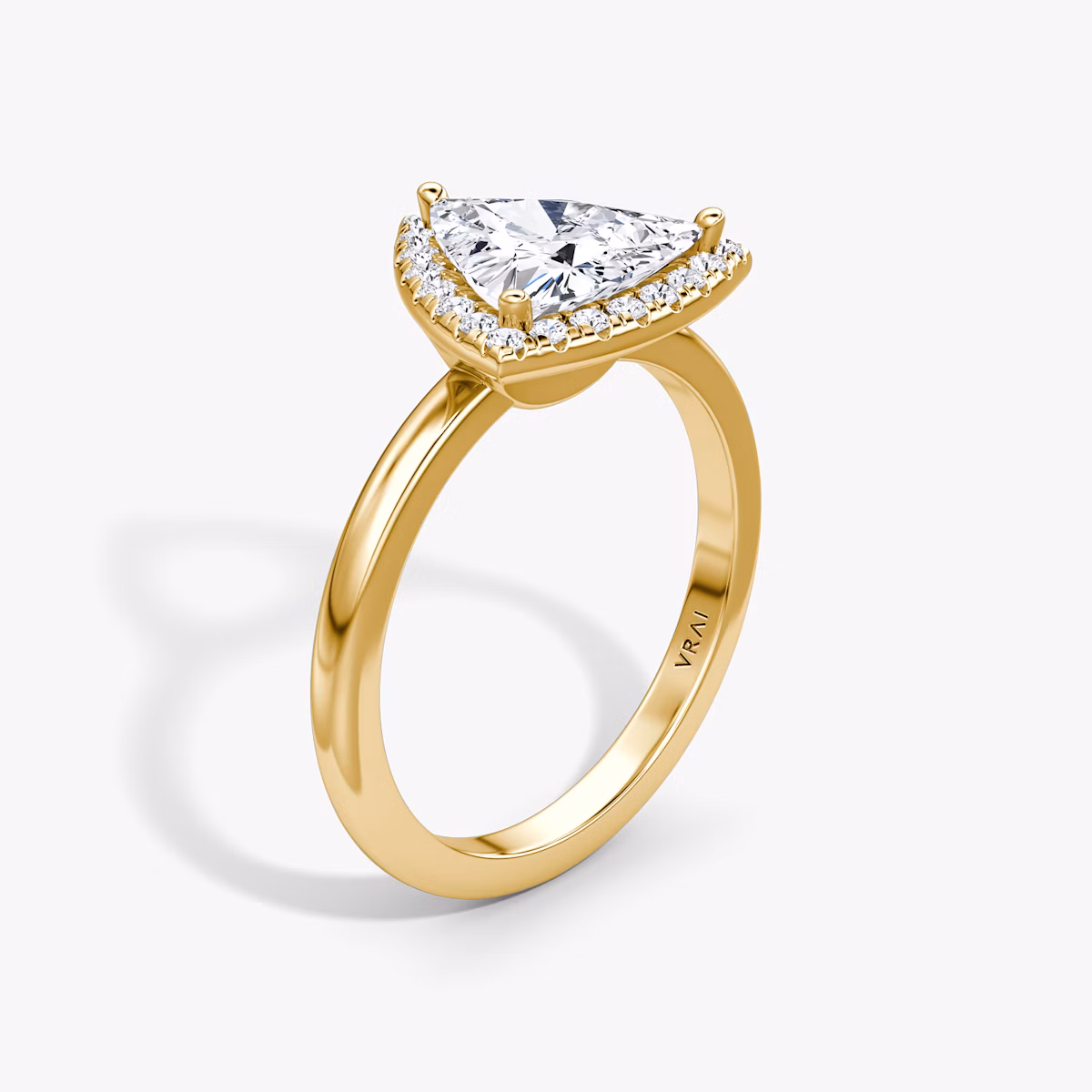 The Halo engagement ring is our rendition of a classically romantic setting. A radiant series of individually handset pavé VRAI created diamonds accent the brilliance of your center stone. Thoughtfully designed to sit low on your finger and flush with your wedding band, our signature sling dips slightly below the band, drawing in light so your VRAI created diamond shines bright.