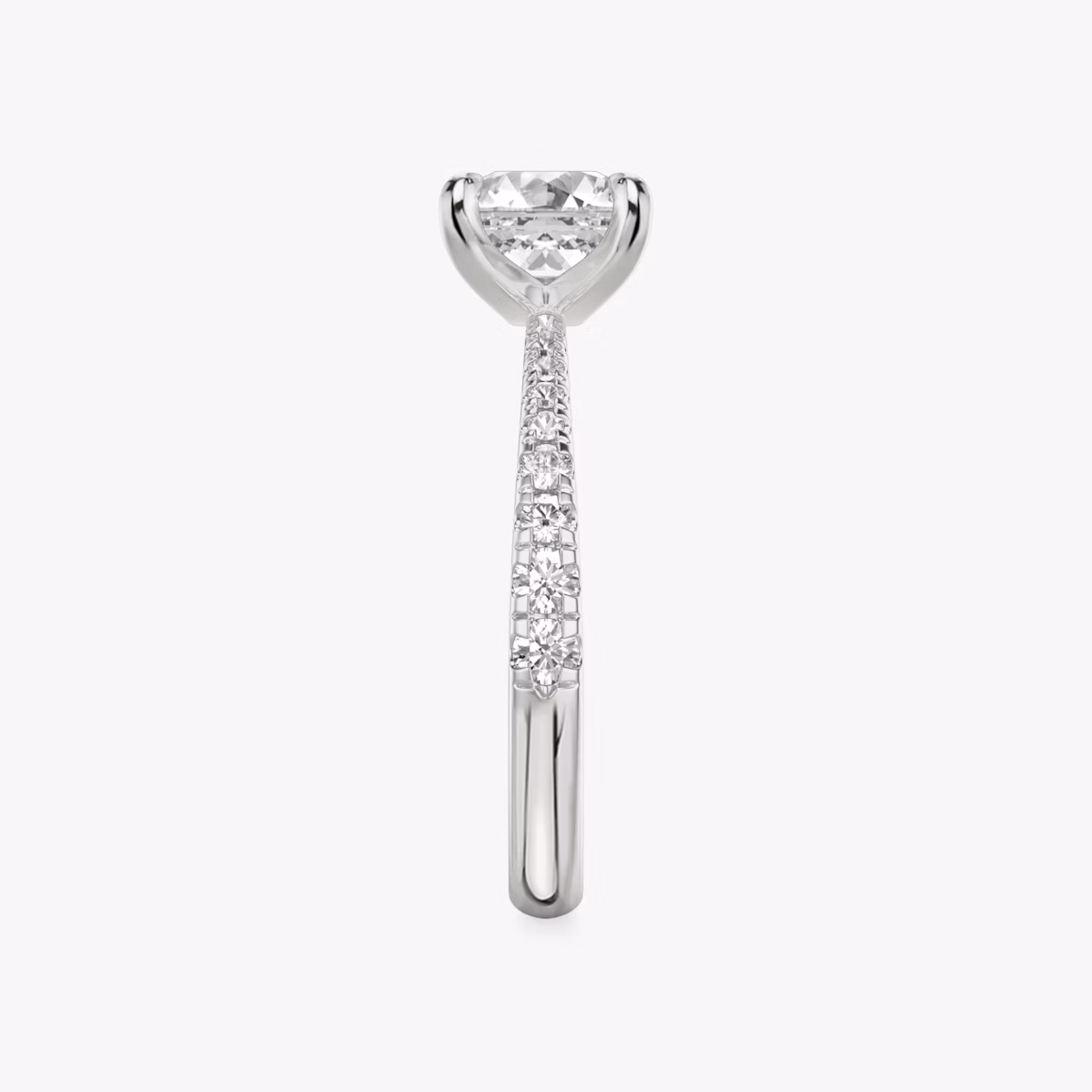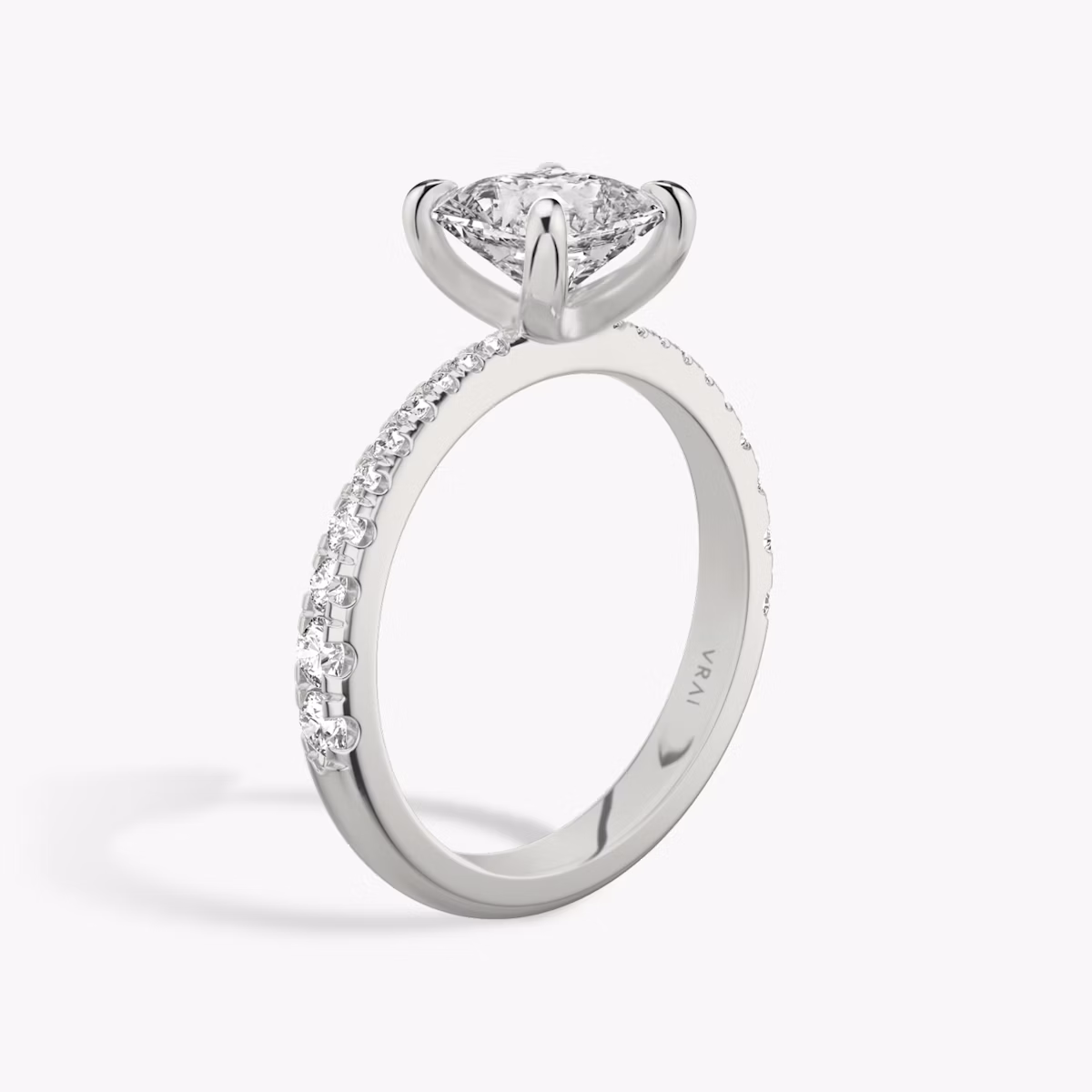 Modern meets vintage-inspired in this twist on our Classic engagement ring setting. The platinum or solid gold setting is tapered at the head, creating clean lines that draw attention to the solitaire VRAI created diamond. Four curved prongs solely caress the center stone, allowing light to enter from all directions for maximum brilliance.