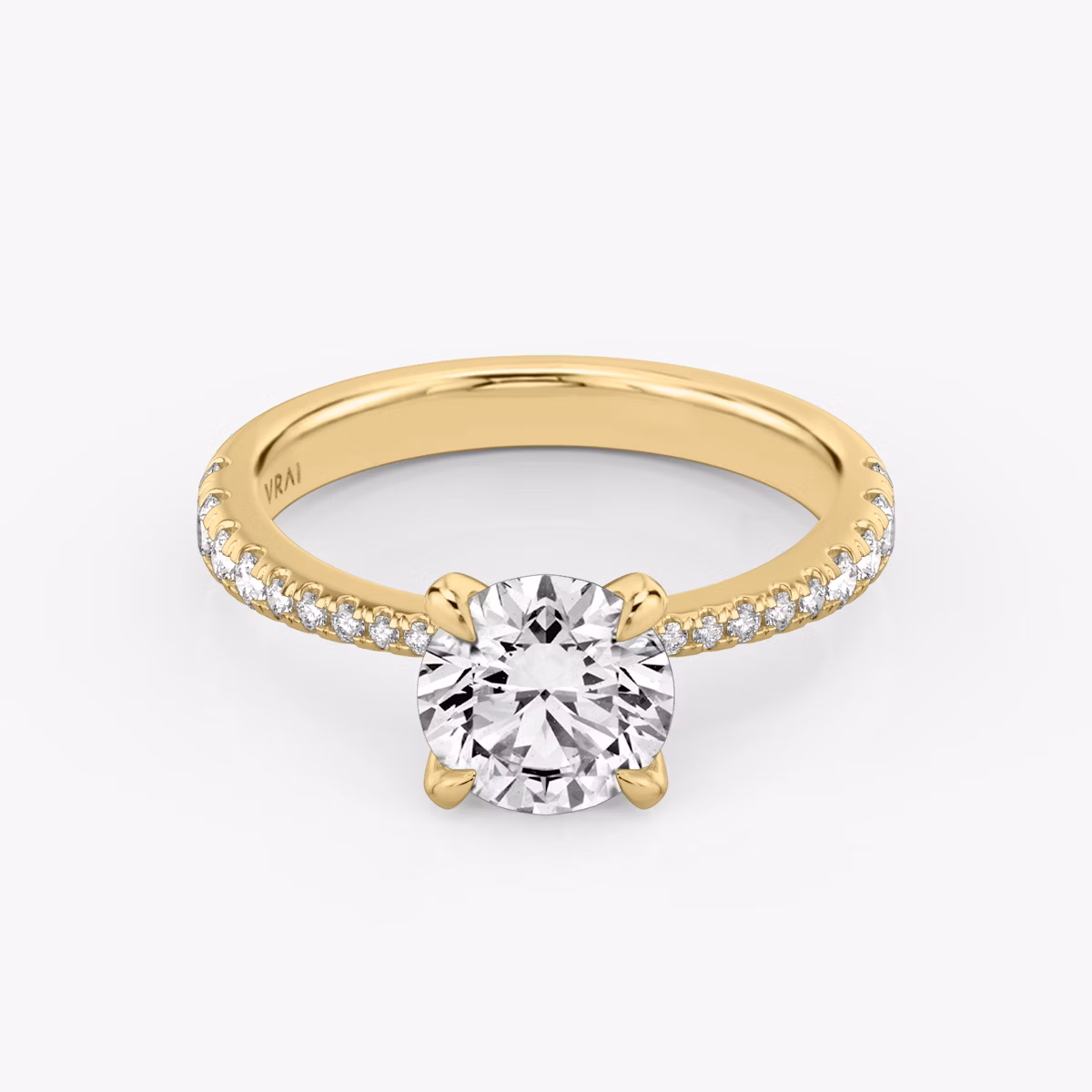 Modern meets vintage-inspired in this twist on our Classic engagement ring setting. The platinum or solid gold setting is tapered at the head, creating clean lines that draw attention to the solitaire VRAI created diamond. Four curved prongs solely caress the center stone, allowing light to enter from all directions for maximum brilliance.