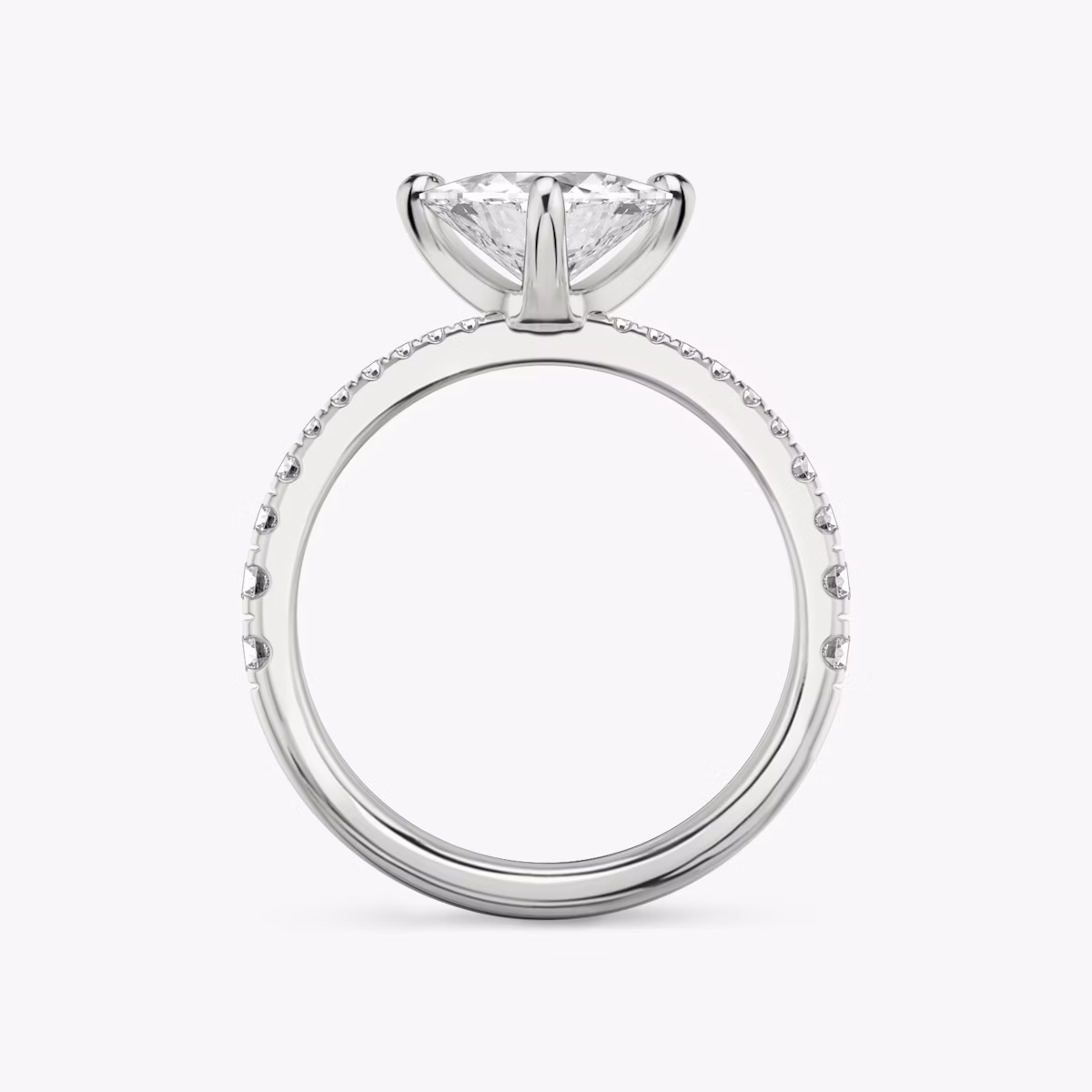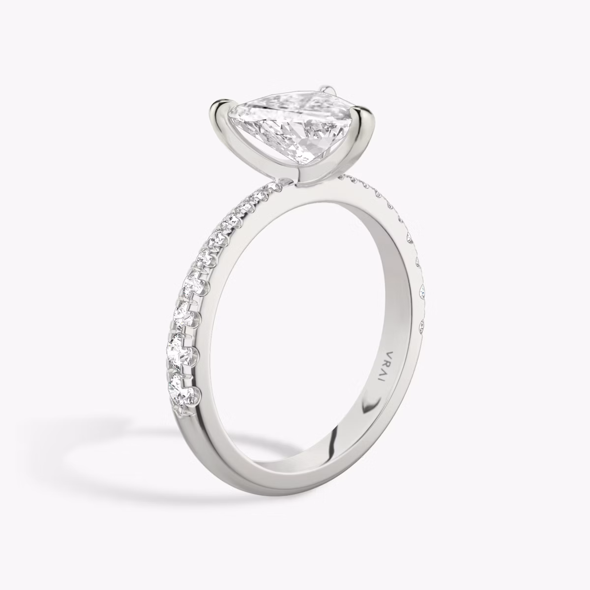 Modern meets vintage-inspired in this twist on our Classic engagement ring setting. The platinum or solid gold setting is tapered at the head, creating clean lines that draw attention to the solitaire VRAI created diamond. Four curved prongs solely caress the center stone, allowing light to enter from all directions for maximum brilliance.