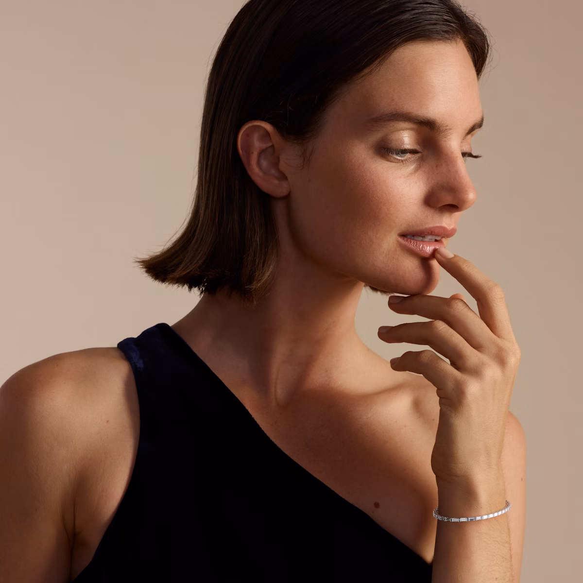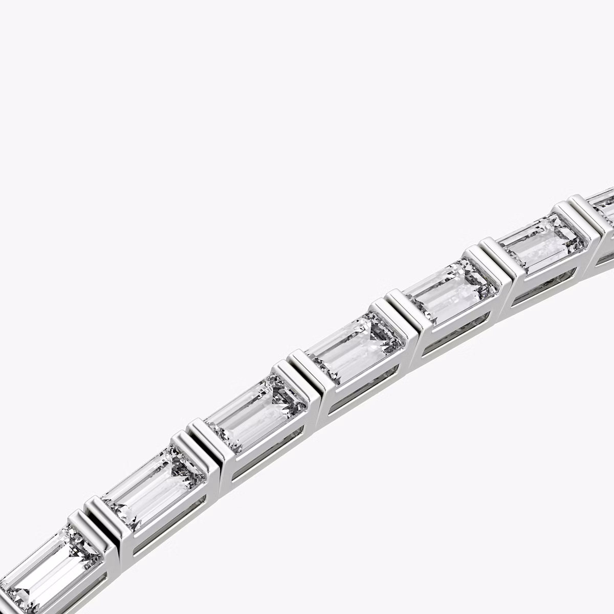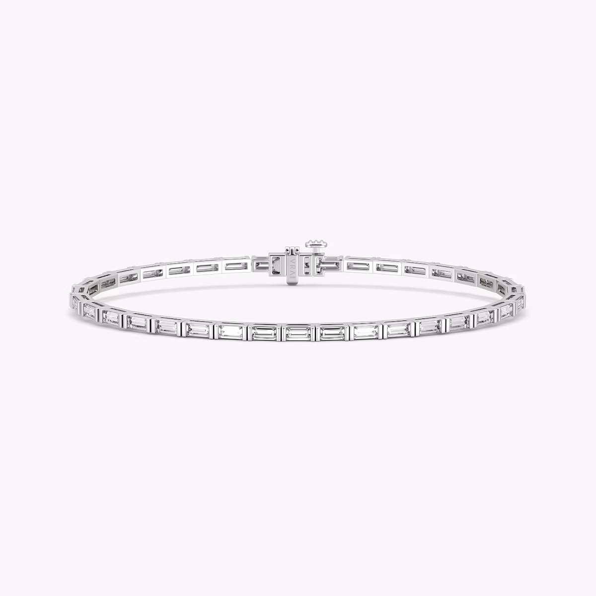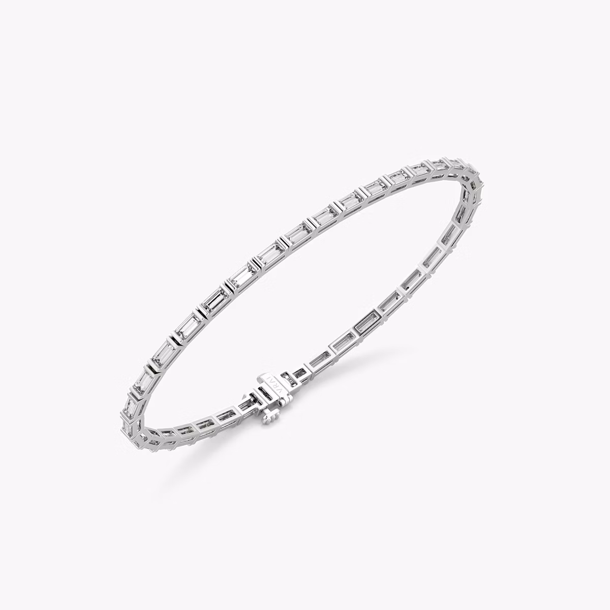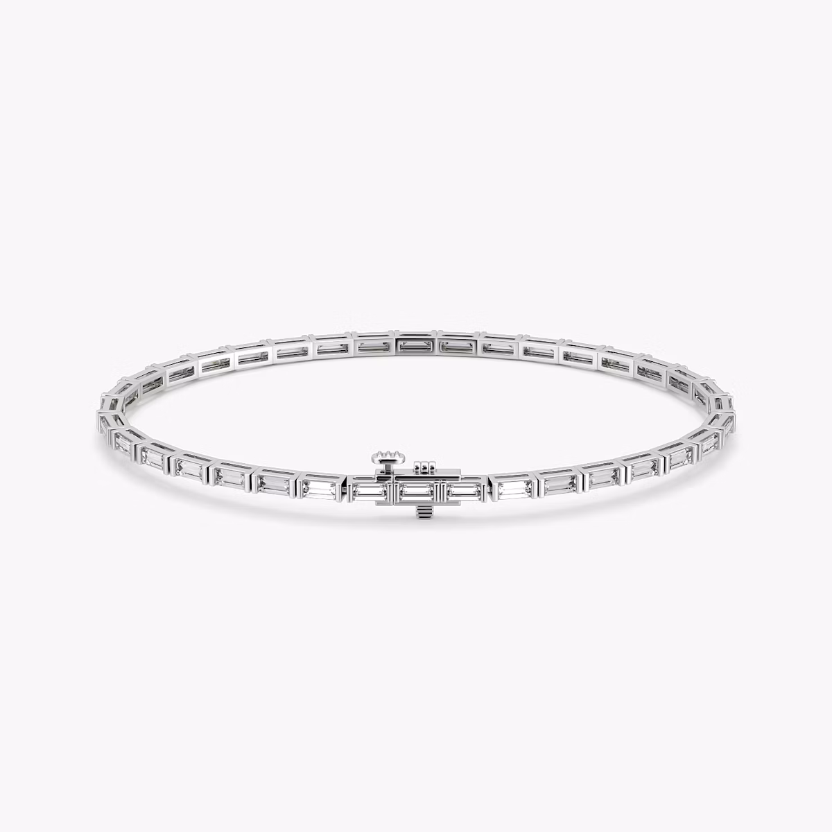 Refined to the core, the VRAI created diamond Baguette Tennis Bracelet is our signature take on a historic design. Individually polished and linked by hand, a seamless row of Baguette VRAI created diamonds sparkles within a minimal setting, laying flush on your wrist for an elegant profile. Fastened with a box clasp closure to ensure security without compromising the subtle sophistication of this classic design.