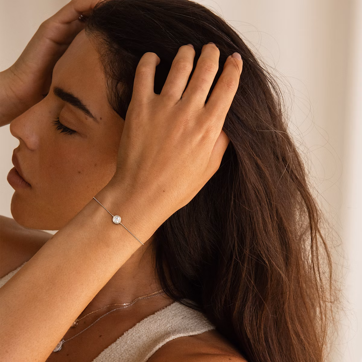 The Bezel Solitaire Bracelet combines vintage-inspired detail and modern appeal together for a look that’s timelessly elegant. A 14k solid gold bezel setting and matching chain outlines the distinctive form of eight different VRAI created diamond shapes in customizable sizes while drawing in and bouncing light in every direction.