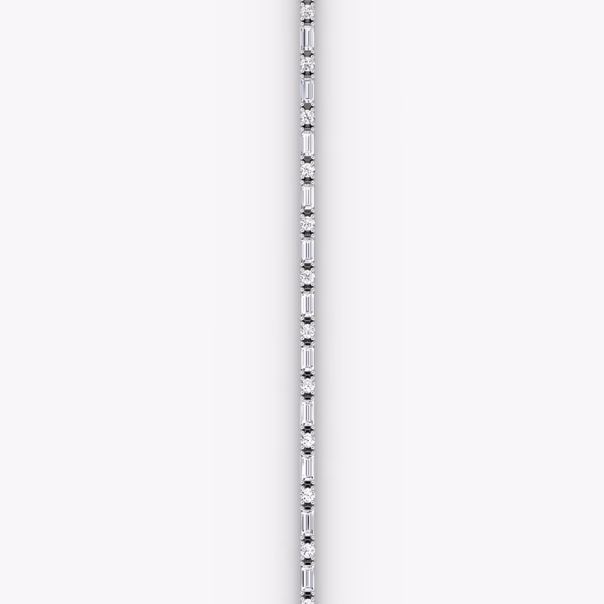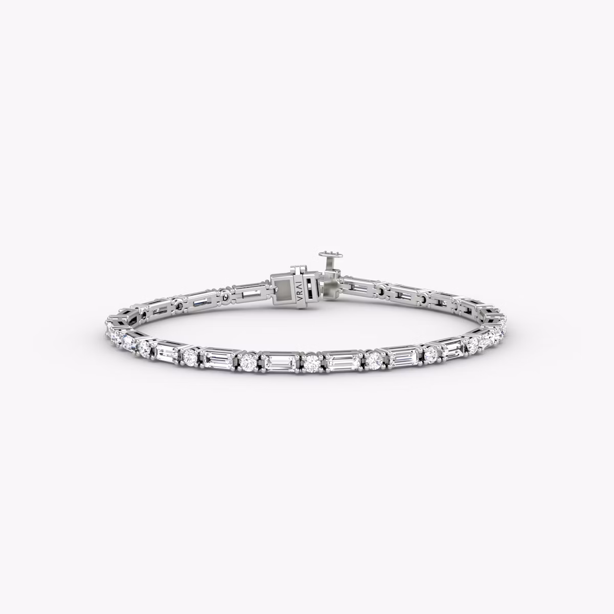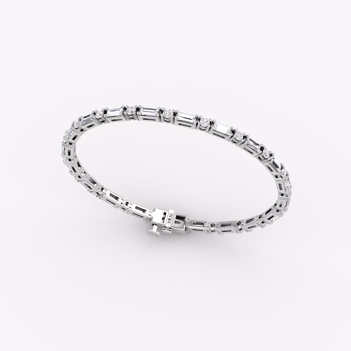 An array of alternating VRAI created diamond shapes line up side by side in this masterfully-crafted tennis bracelet design. Round Brilliant and Emerald or Baguette shaped diamonds are seamlessly linked together in a solid gold setting that fully displays their beauty and brilliance.
