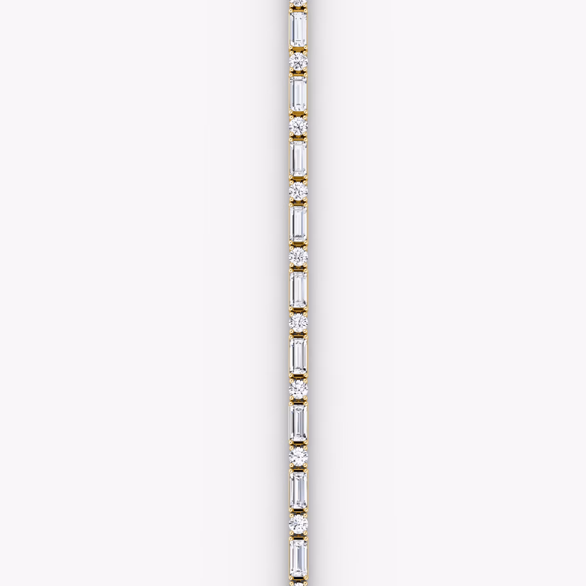 An array of alternating VRAI created diamond shapes line up side by side in this masterfully-crafted tennis bracelet design. Round Brilliant and Emerald or Baguette shaped diamonds are seamlessly linked together in a solid gold setting that fully displays their beauty and brilliance.