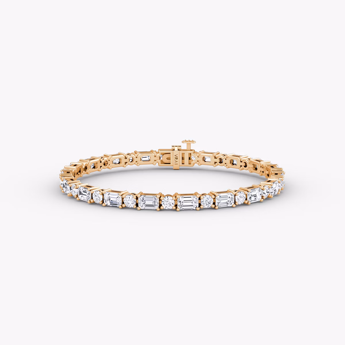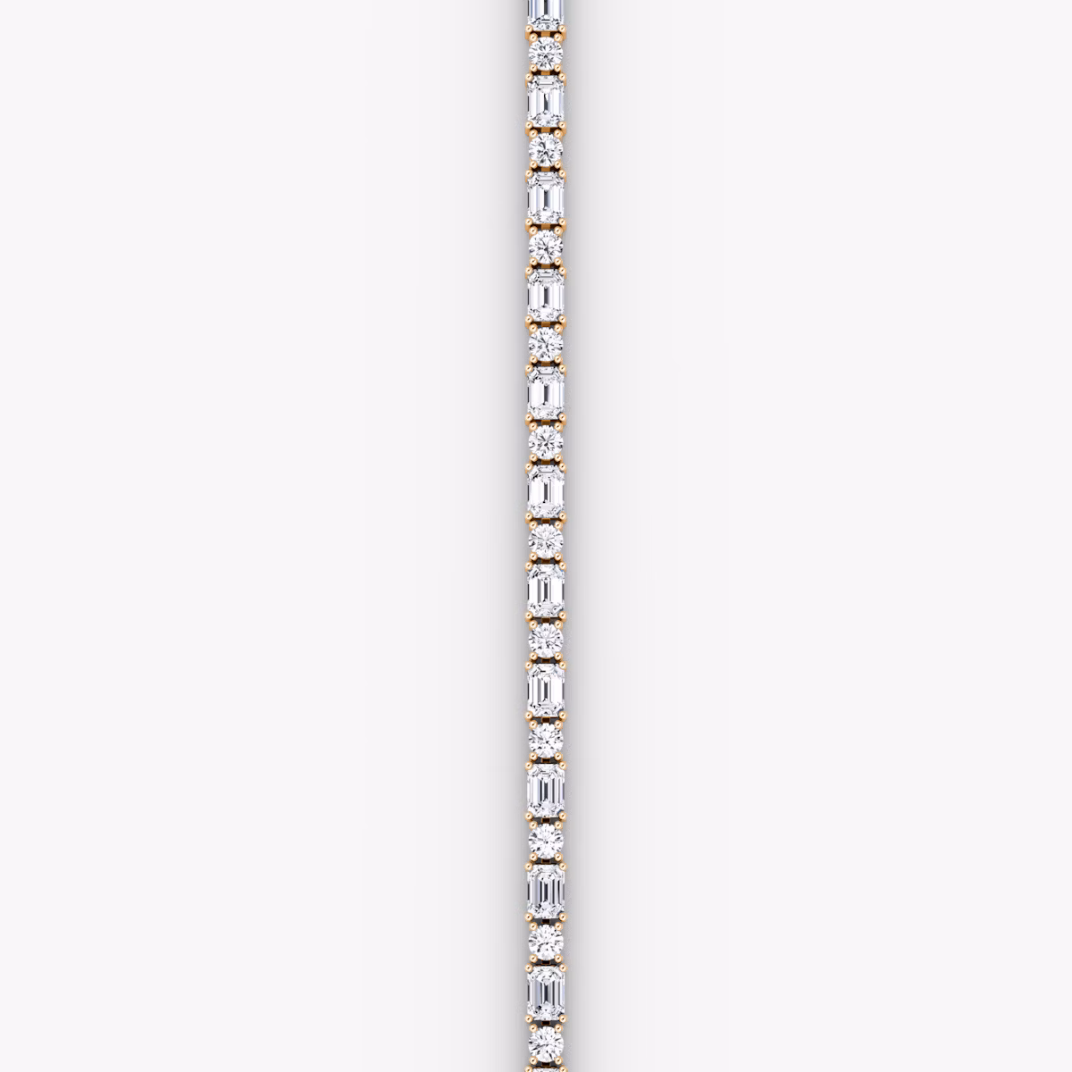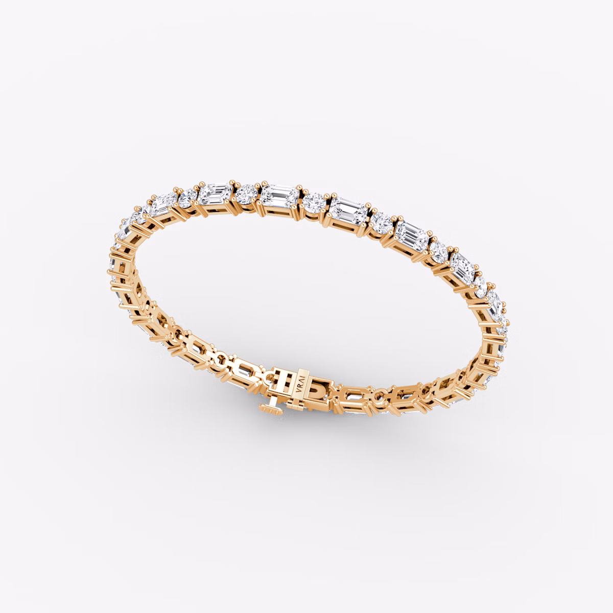 An array of alternating VRAI created diamond shapes line up side by side in this masterfully-crafted tennis bracelet design. Round Brilliant and Emerald or Baguette shaped diamonds are seamlessly linked together in a solid gold setting that fully displays their beauty and brilliance.