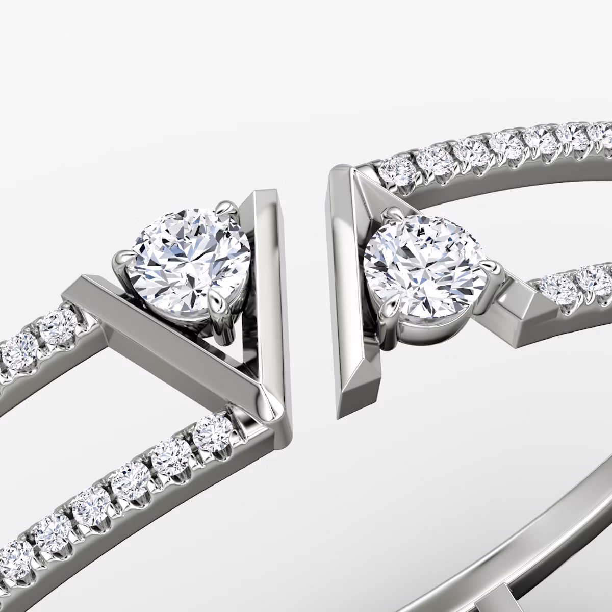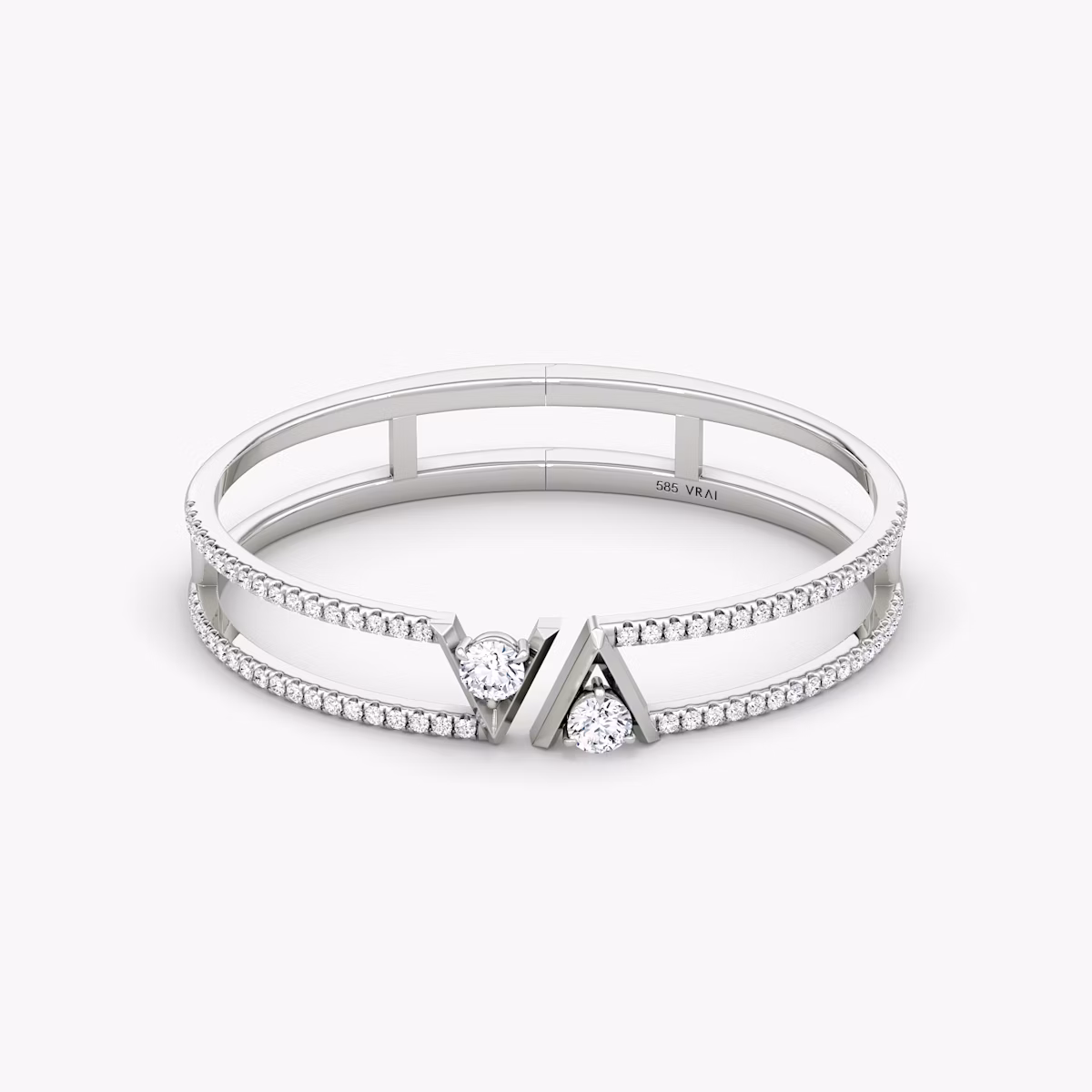 A statement piece made to stand alone or layer, but always set you apart. The VRAI V Double Row Bangle features a hidden spring hinge, as well as a duo of knife-edge V settings to lift and secure Round Brilliant VRAI created diamonds in place. Make this innovative design your own in plain or pavé styles.