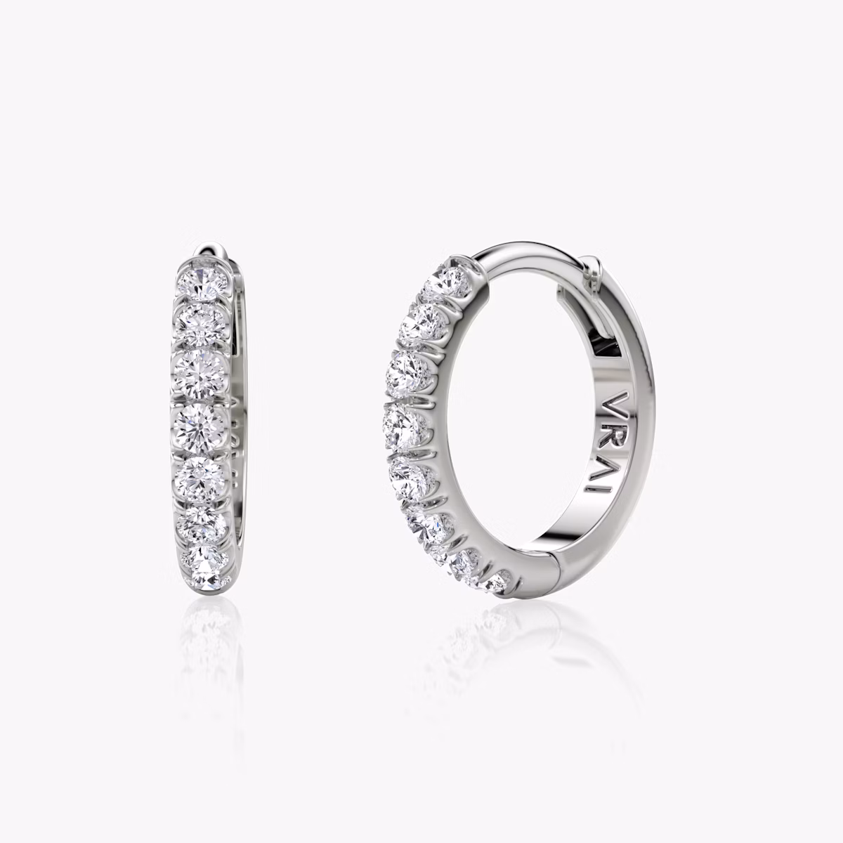 Effortlessly elegant staples updated for your every look. Solid gold or sterling silver hoops shine even brighter with an array of pavé VRAI created diamonds that catch the light with every step you take. The large hoops are perfect for solo wear or first piercings. Petite and medium sizes are true to their original huggie design and sit close to the lobe, making them perfect for stacking and second piercings.