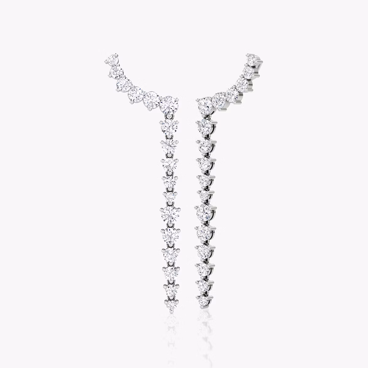 An array of Round Brilliant VRAI created diamonds dangle down low, while even more ascend the arc of the ear to dramatic effect. This decidedly bold and alluring pair features 34 VRAI created diamonds linked together in a 14k white gold setting that spotlight each diamond’s brilliance.
