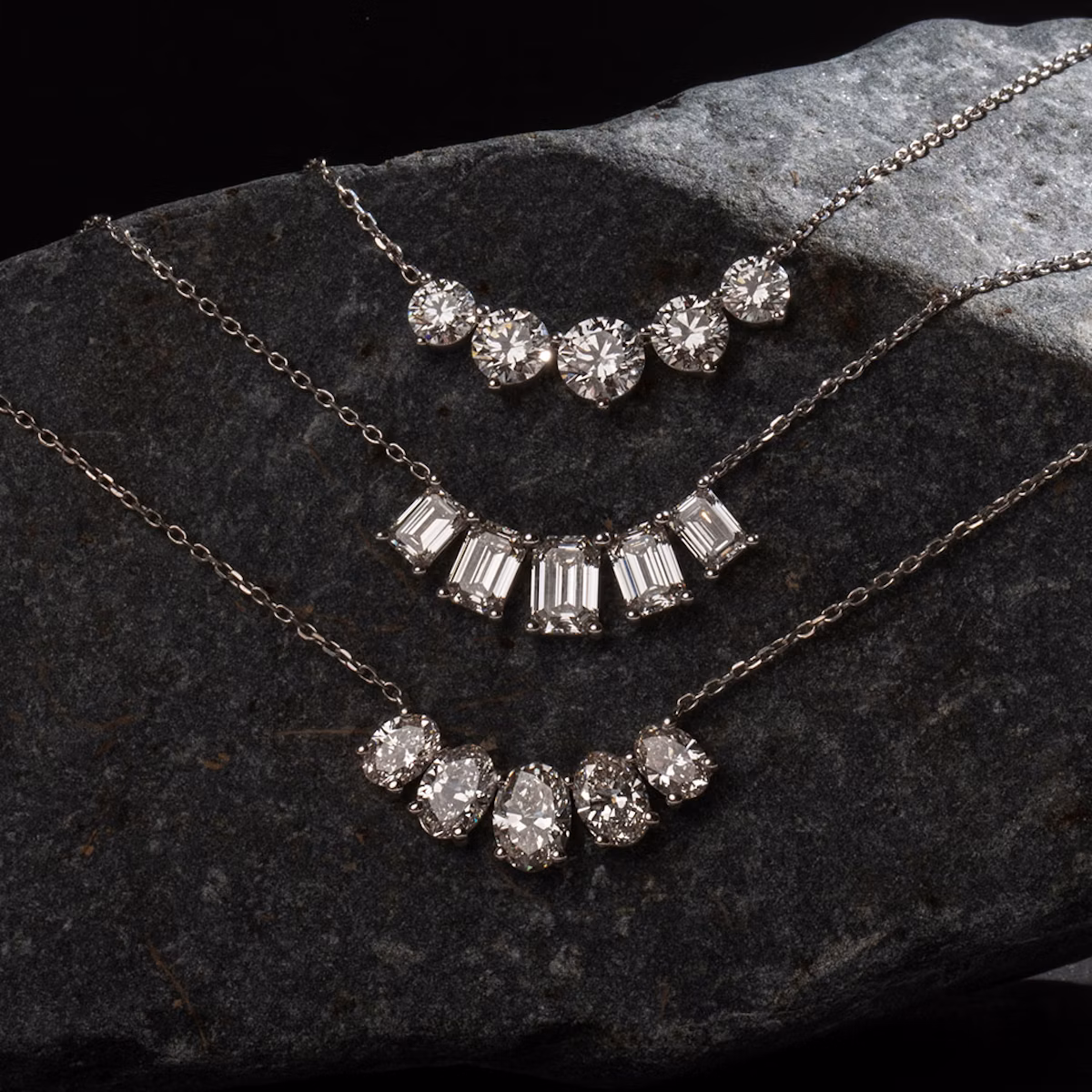 Our Arc Necklace symbolizes the meaning and moments to keep close to their heart. This celebratory design features an ensemble of VRAI created diamond shapes highlighted in a 14k solid gold setting and matching chain for spectacular shine.