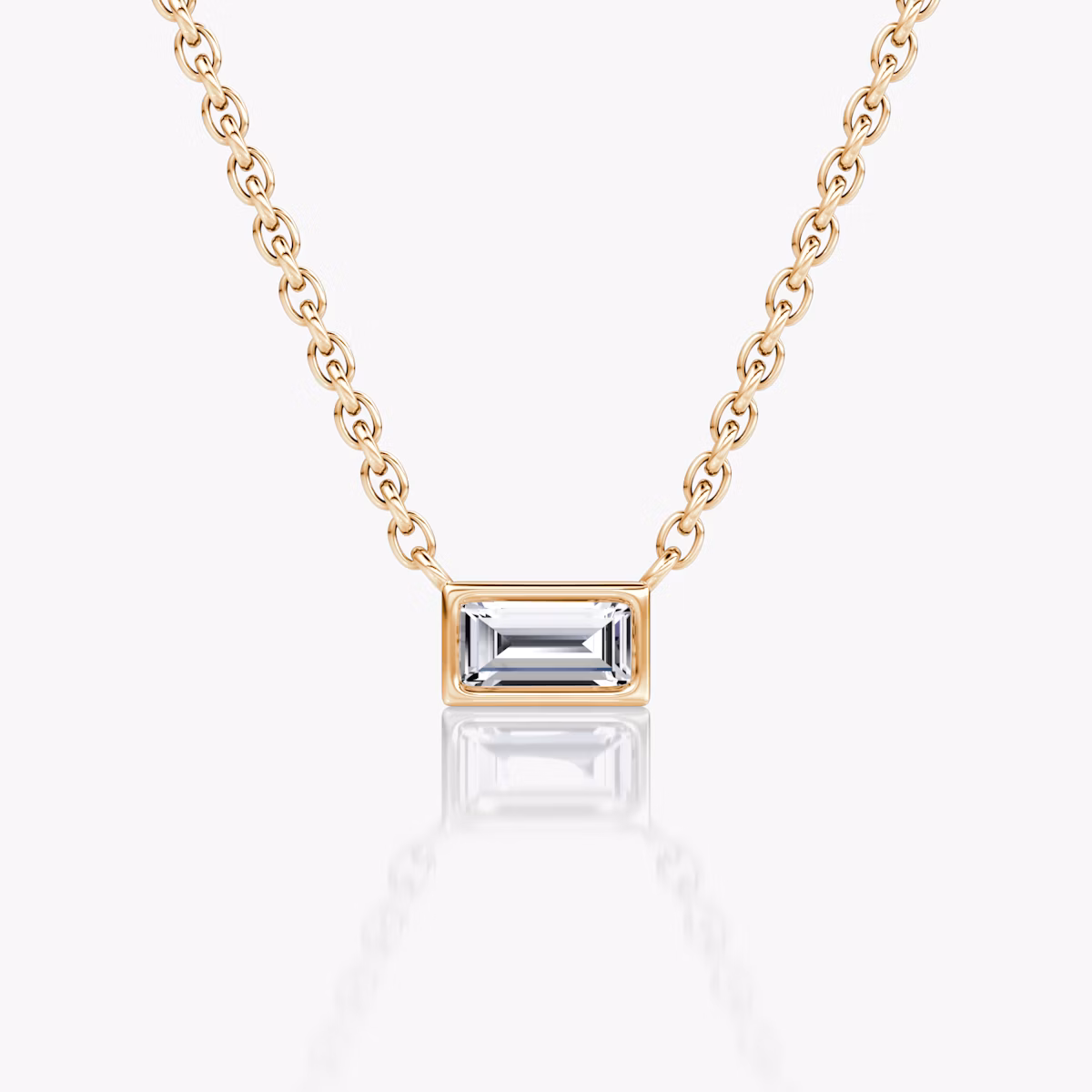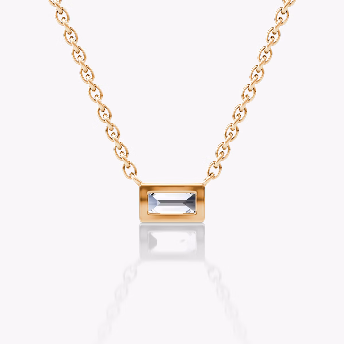 The Bezel Solitaire Necklace combines vintage-inspired detail and modern appeal together for a look that’s timelessly elegant. A 14k solid gold bezel setting and matching chain outlines the distinctive form of eight different VRAI created diamond shapes in customizable sizes while drawing in and bouncing light in every direction.