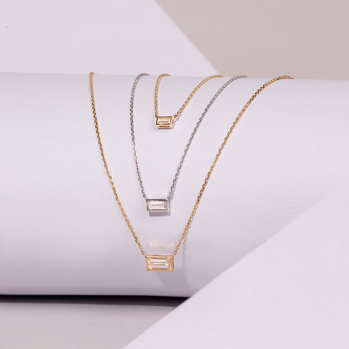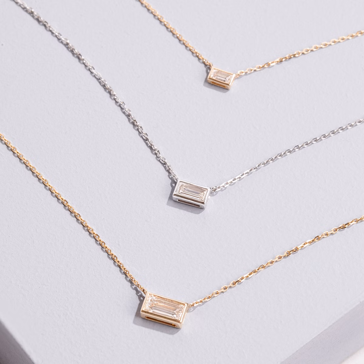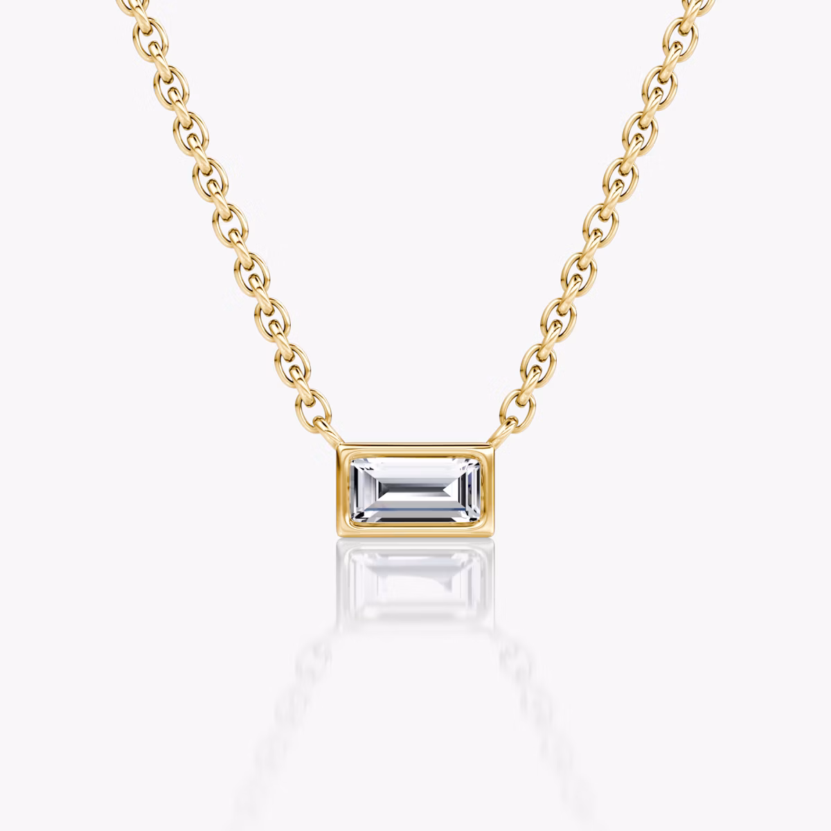 The Bezel Solitaire Necklace combines vintage-inspired detail and modern appeal together for a look that’s timelessly elegant. A 14k solid gold bezel setting and matching chain outlines the distinctive form of eight different VRAI created diamond shapes in customizable sizes while drawing in and bouncing light in every direction.