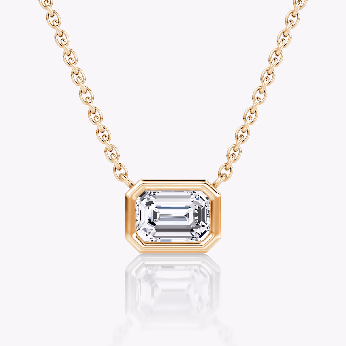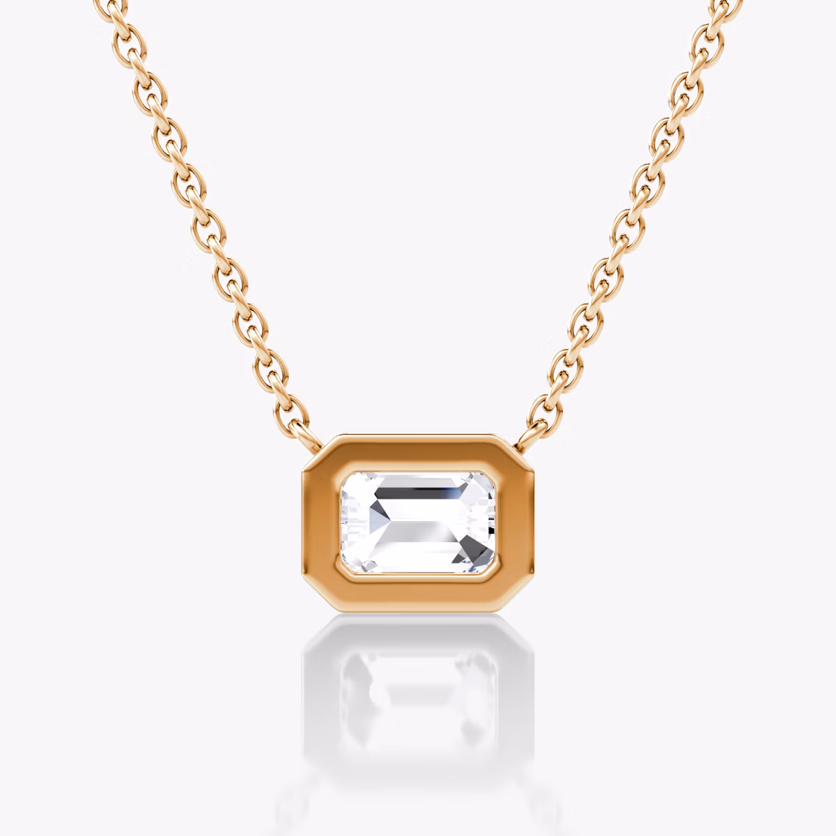 The Bezel Solitaire Necklace combines vintage-inspired detail and modern appeal together for a look that’s timelessly elegant. A 14k solid gold bezel setting and matching chain outlines the distinctive form of eight different VRAI created diamond shapes in customizable sizes while drawing in and bouncing light in every direction.