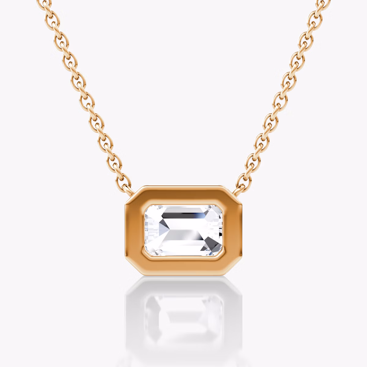 The Bezel Solitaire Necklace combines vintage-inspired detail and modern appeal together for a look that’s timelessly elegant. A 14k solid gold bezel setting and matching chain outlines the distinctive form of eight different VRAI created diamond shapes in customizable sizes while drawing in and bouncing light in every direction.