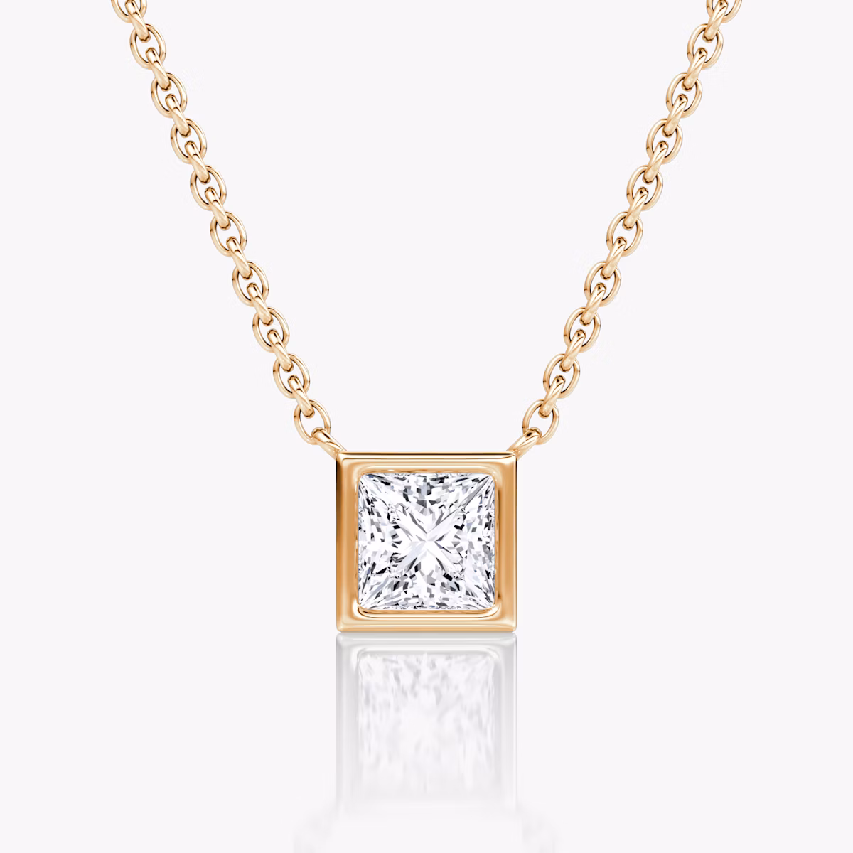 The Bezel Solitaire Necklace combines vintage-inspired detail and modern appeal together for a look that’s timelessly elegant. A 14k solid gold bezel setting and matching chain outlines the distinctive form of eight different VRAI created diamond shapes in customizable sizes while drawing in and bouncing light in every direction.