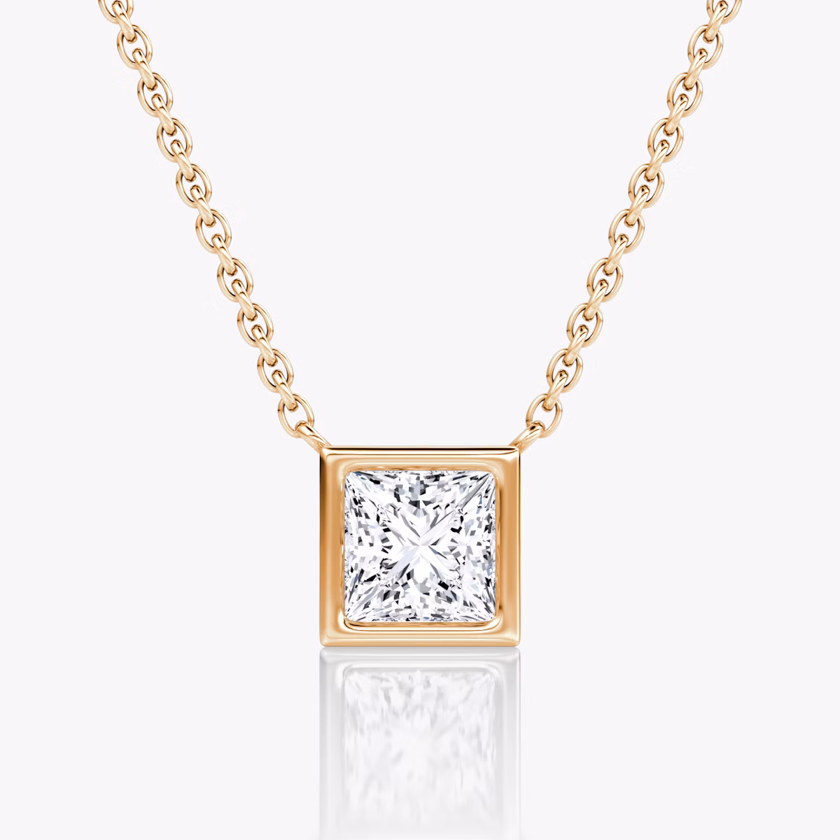 The Bezel Solitaire Necklace combines vintage-inspired detail and modern appeal together for a look that’s timelessly elegant. A 14k solid gold bezel setting and matching chain outlines the distinctive form of eight different VRAI created diamond shapes in customizable sizes while drawing in and bouncing light in every direction.