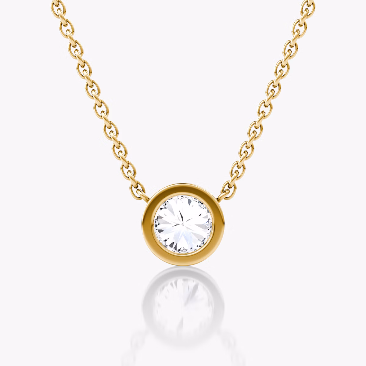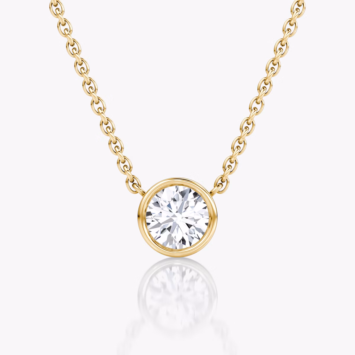 The Bezel Solitaire Necklace combines vintage-inspired detail and modern appeal together for a look that’s timelessly elegant. A 14k solid gold bezel setting and matching chain outlines the distinctive form of eight different VRAI created diamond shapes in customizable sizes while drawing in and bouncing light in every direction.