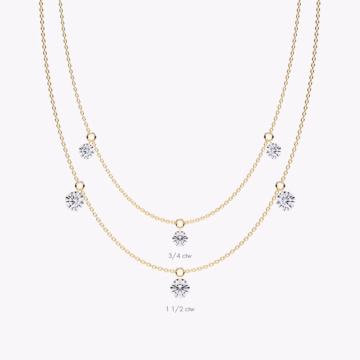 The Floating Station Necklace features a series of 0.25 or 0.50 carat Round Brilliant VRAI created diamonds that gently dangle from their pierced-diamond settings for effortless elegance and maximum scintillation. Customize your necklace in 14k solid yellow or white gold and choose 3 or 5 stones for a look that’s true to your everyday style.